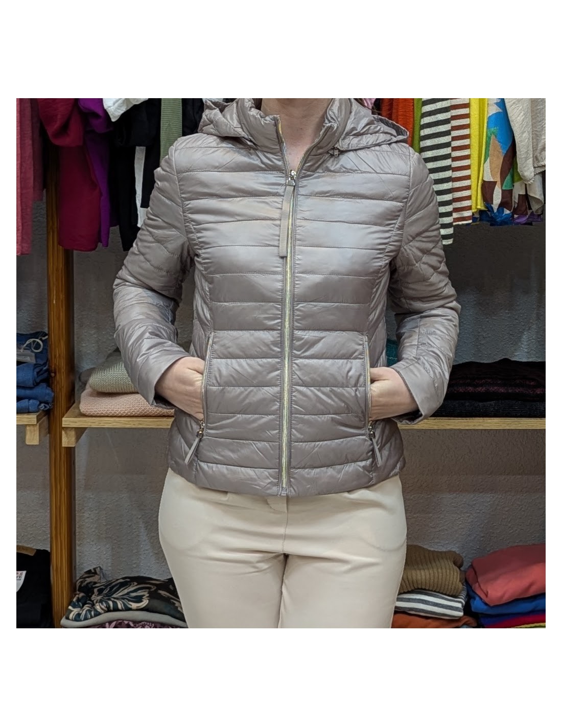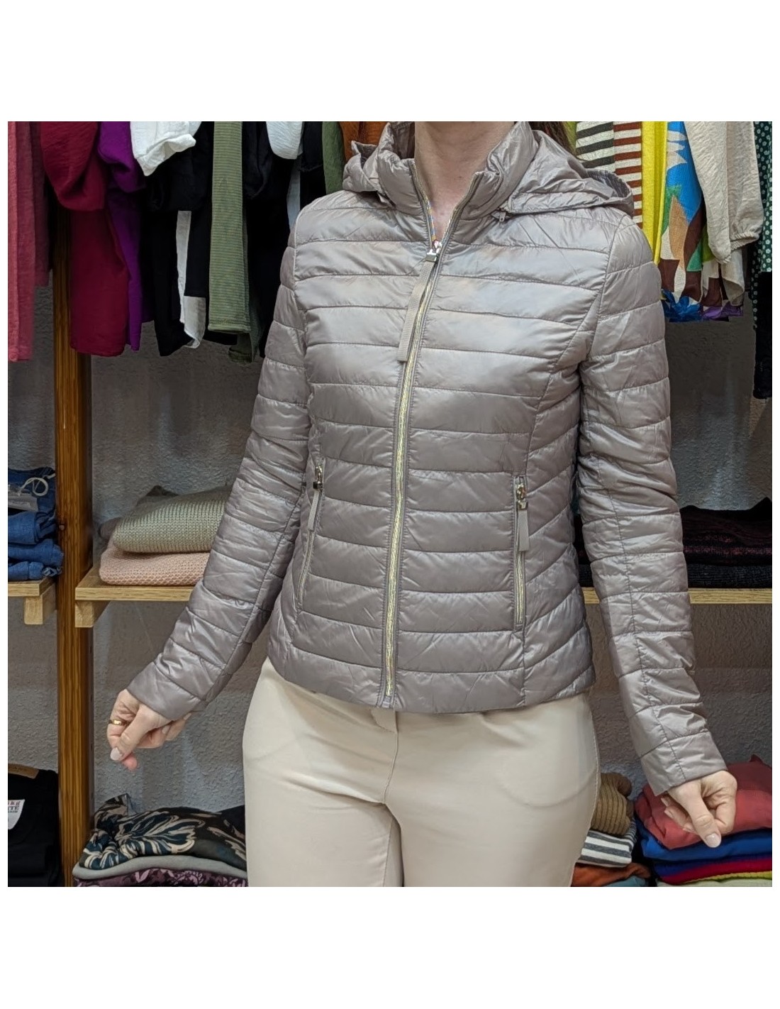 Un básico imprescindible para los días de frío. Anorak ligero en color taupe de diseño acolchado y cierre con cremallera. Bolsillos laterales con cremallera y capucha con cremallera para poder quitarla.