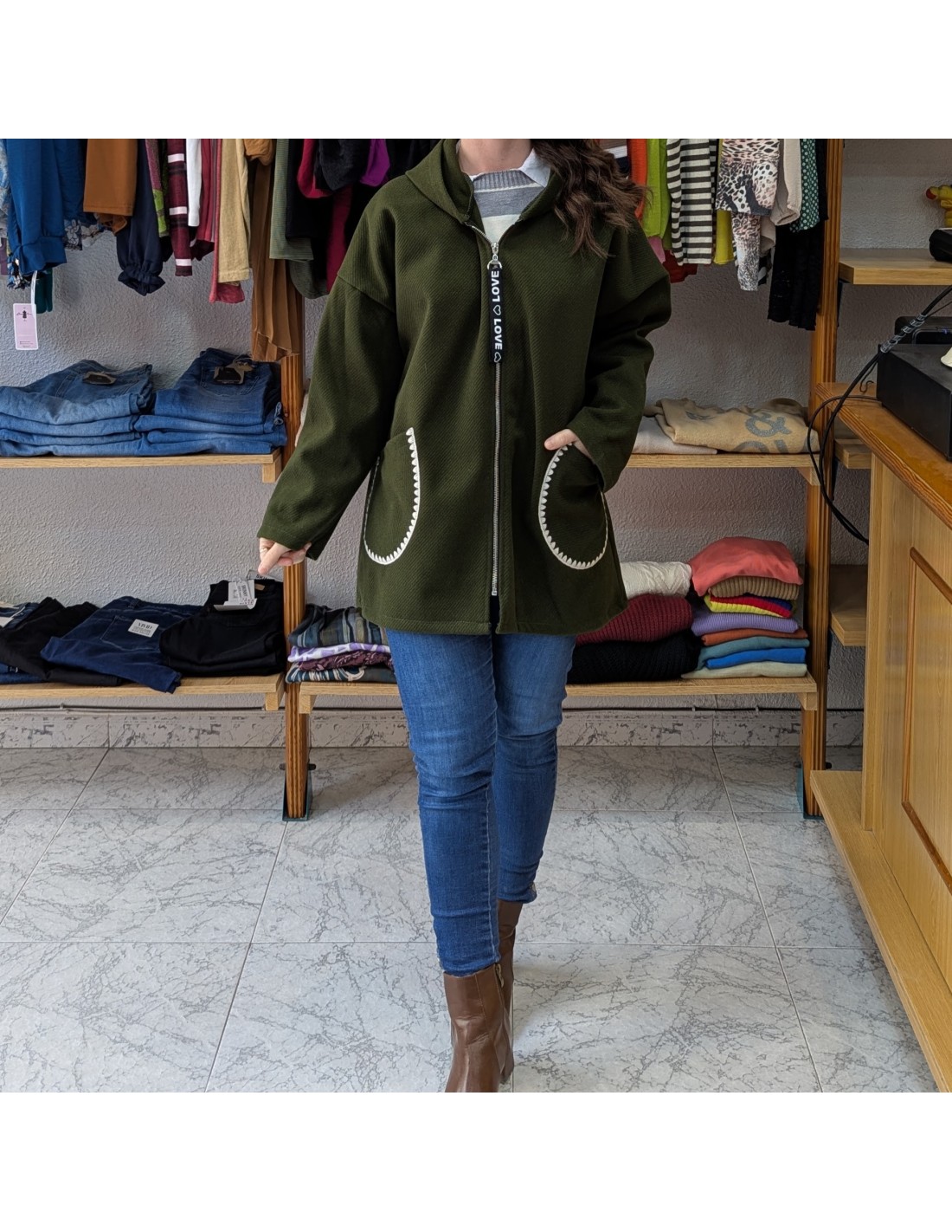 Abrigo de paño para talla grande, de tejido cálido y suave, tiene gorro, bolsillos amplios en la parte frontal y cierre de cremallera, más largo por detrás.