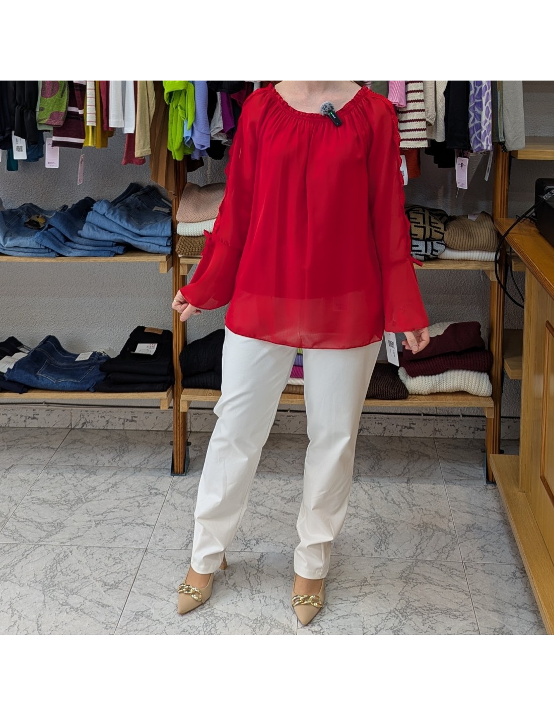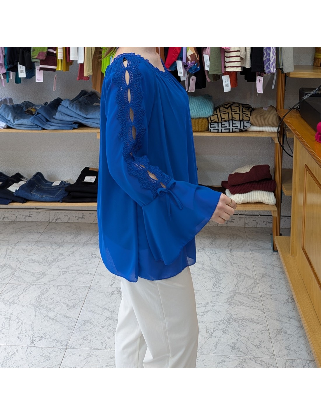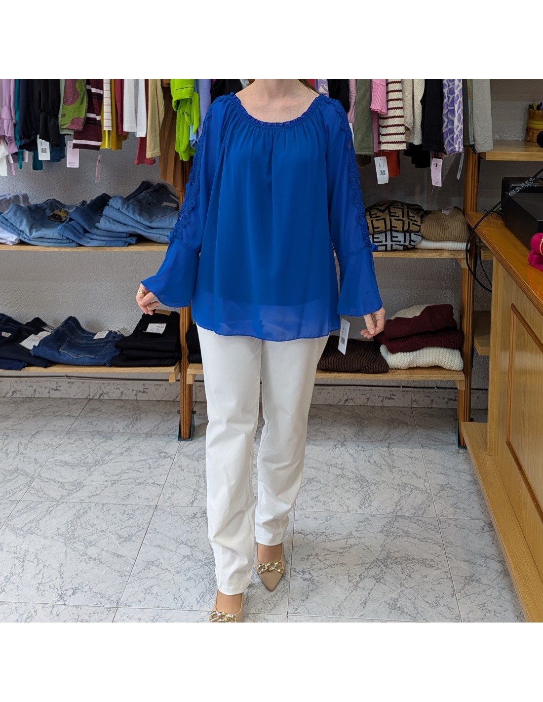 Blusa de gasa de silueta fluida con mangas acampanadas con detalles de encaje calado en las mangas y tiene escote barco con detalles fruncidos.