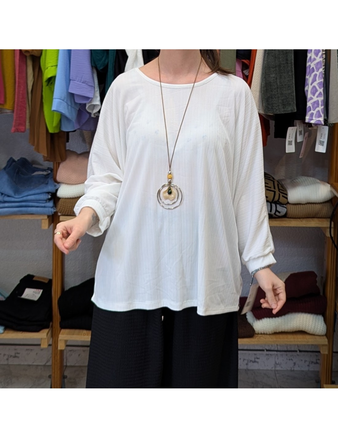 Elegante blusa de vestir para talla grande con cuello redondo y manga japonesa, tiene textura acanalada.