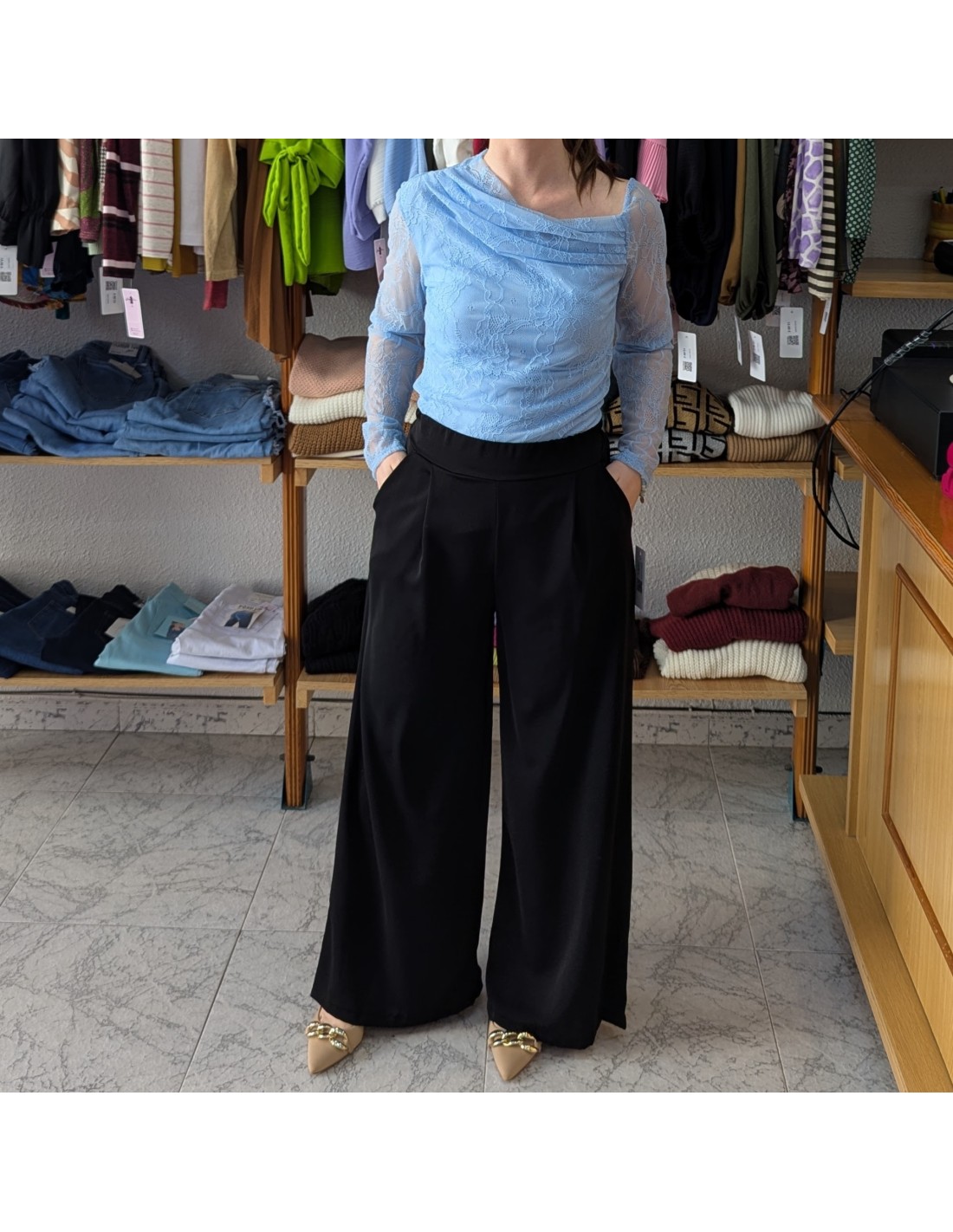 Blusa de encaje floral con manga larga y un distintivo cuello asimétrico drapeado. Tiene forro en todo el cuerpo. Perfecta para eventos.