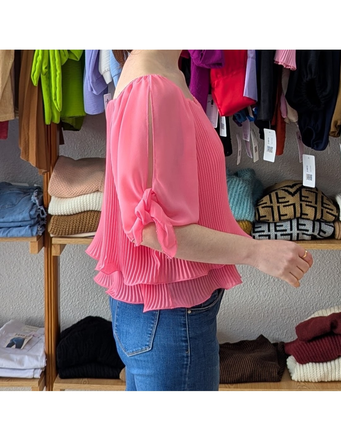 Elegante blusa de gasa, cuello estilo barca, manga al codo con detalle de lazo y diseño plisado en todo el cuerpo.