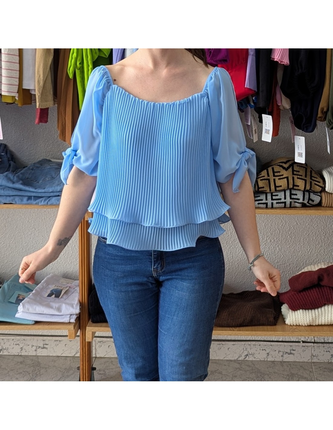 Elegante blusa de gasa, cuello estilo barca, manga al codo con detalle de lazo y diseño plisado en todo el cuerpo.