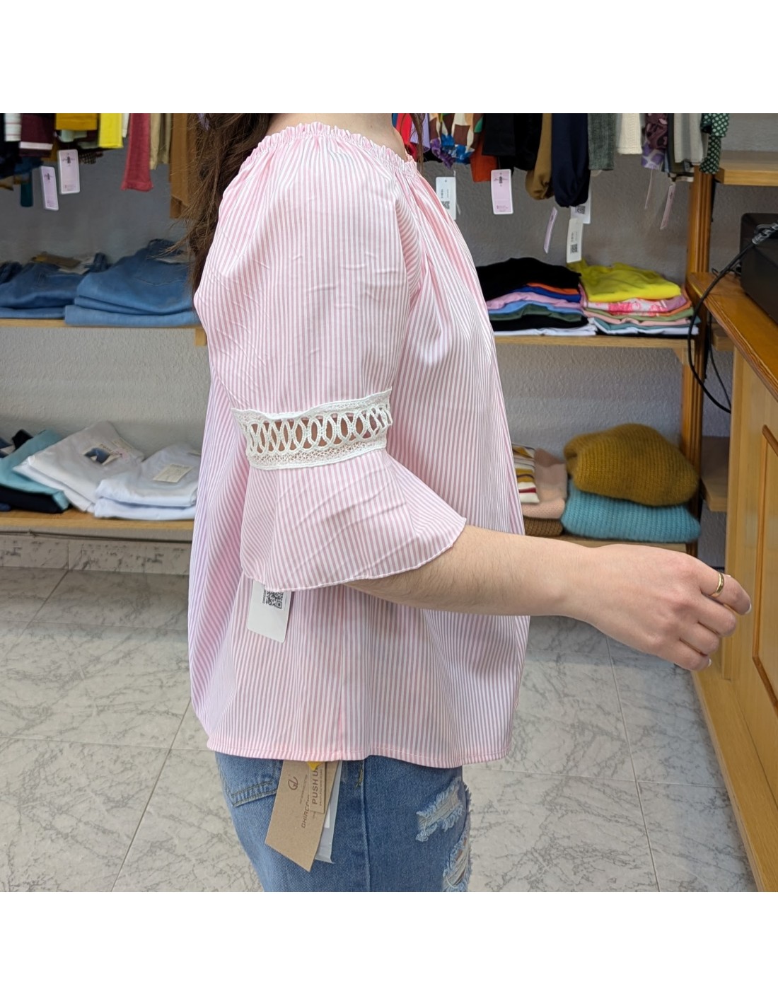 Blusa de estilo romántico, con estampado de rayas, tiene cuello tipo barca fruncido y elástico, mangas 3/4 con detalle de encaje y puños acampanados. Tejido fresco y cómodo.
