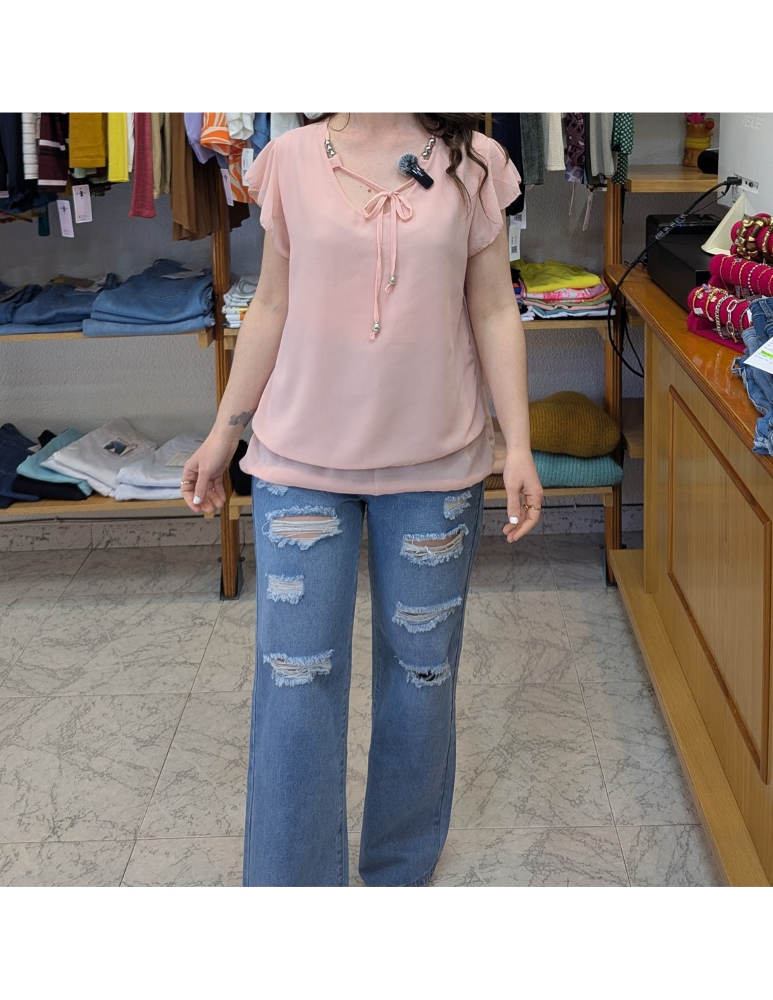 Blusa de gasa con doble capa en la parte delantera, de manga corta con volante y escote en V con lazada y detalles de abalorios.