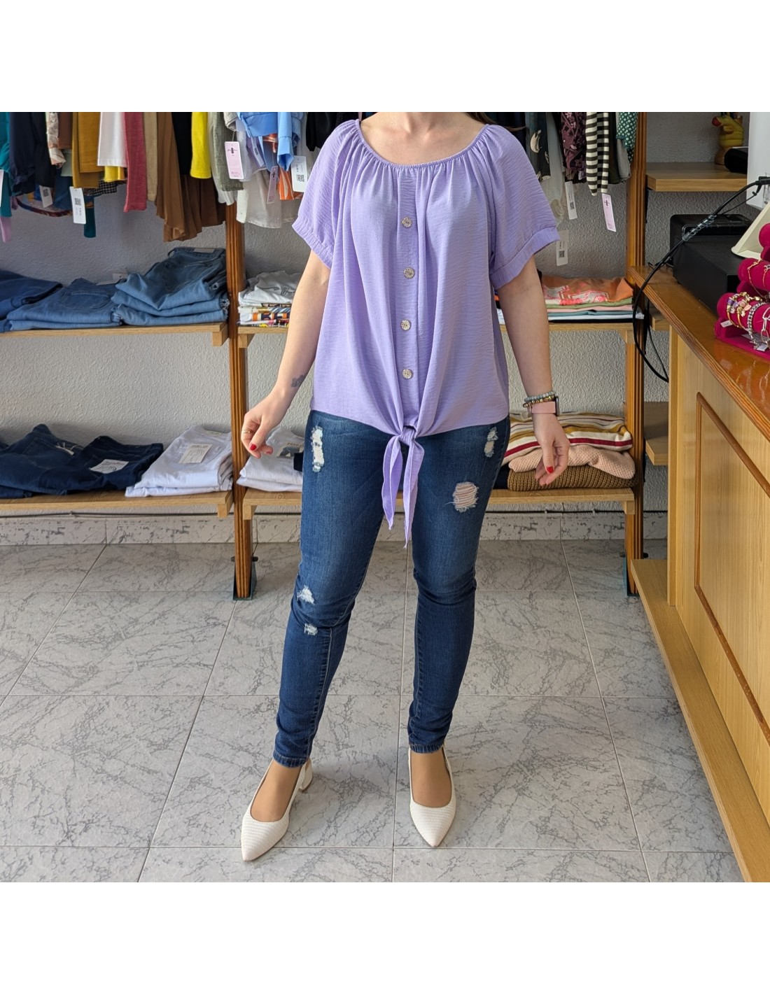 Blusa de talla amplia, es de estilo casual, de manga corta con escote barco y elástico, tiene detalle de botones a lo largo de la prenda y nudo en la parte inferior.