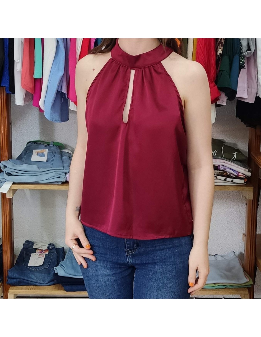 Blusa de tela satinada, abertura en la parte del pecho con cuello halter y anudada en la parte de atrás del cuello.
