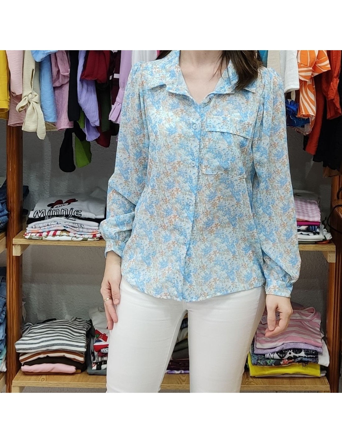 De tejido fino y ligero, cuello italiano, botonadura a lo largo de la prenda, y puños con botón. Detalle de bolsillo en el el pecho, estampado floral.