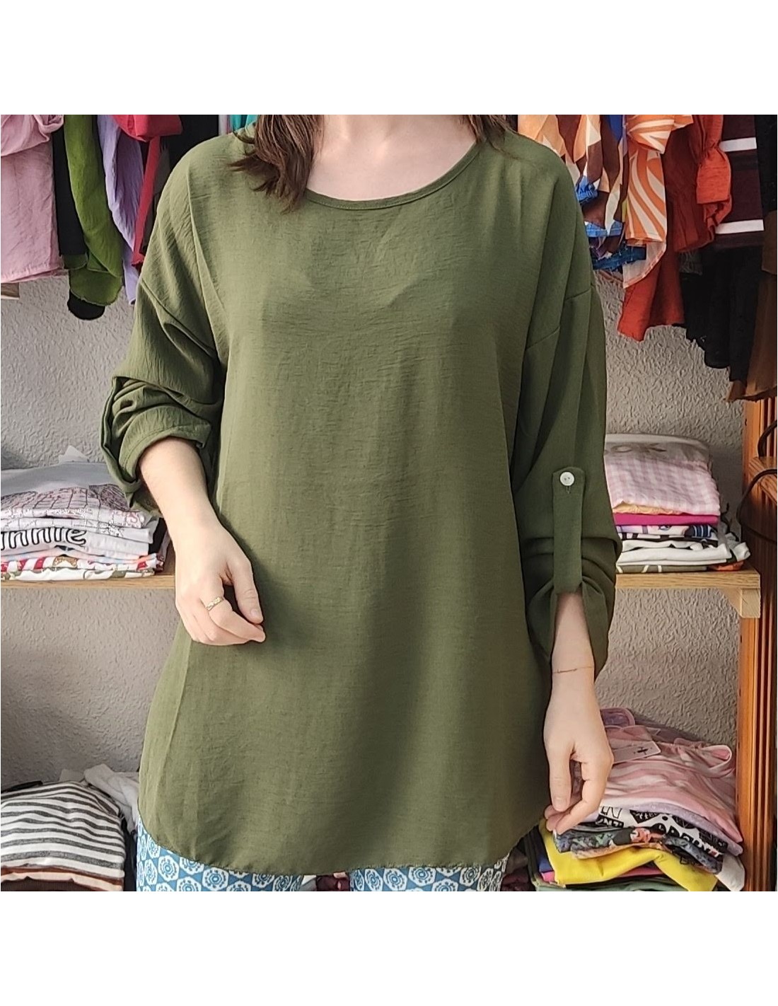 Blusa de talla Amplia, manga larga con opción a manga 3/4, cuello redondo y detalle de abertura con cadena en la espalda, de tejido suave y ligero.