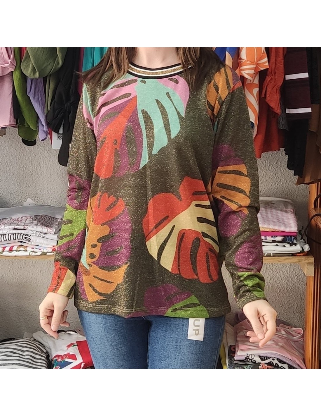 De tejido cálido, suave y ligero, con estampado en colores combinados y armónicos que le aportan un toque fresco y moderno. El diseño cuenta con un sutil brillo dorado que adorna toda la blusa, añadiendo un toque de glamour.