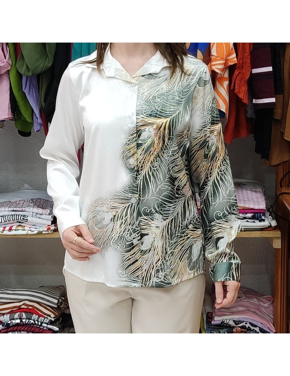 Combina elegancia y comodidad en una sola prenda, Confeccionada en un tejido sedoso de alta calidad, nuestra camisa ofrece suavidad al tacto y una caída impecable que realza la figura, esta prenda atemporal presenta un hermoso estampado que combina a la perfección, además está disponible en 4 colores, permitiéndote elegir el que mejor se adapte a tu estilo personal y a cualquier ocasión.