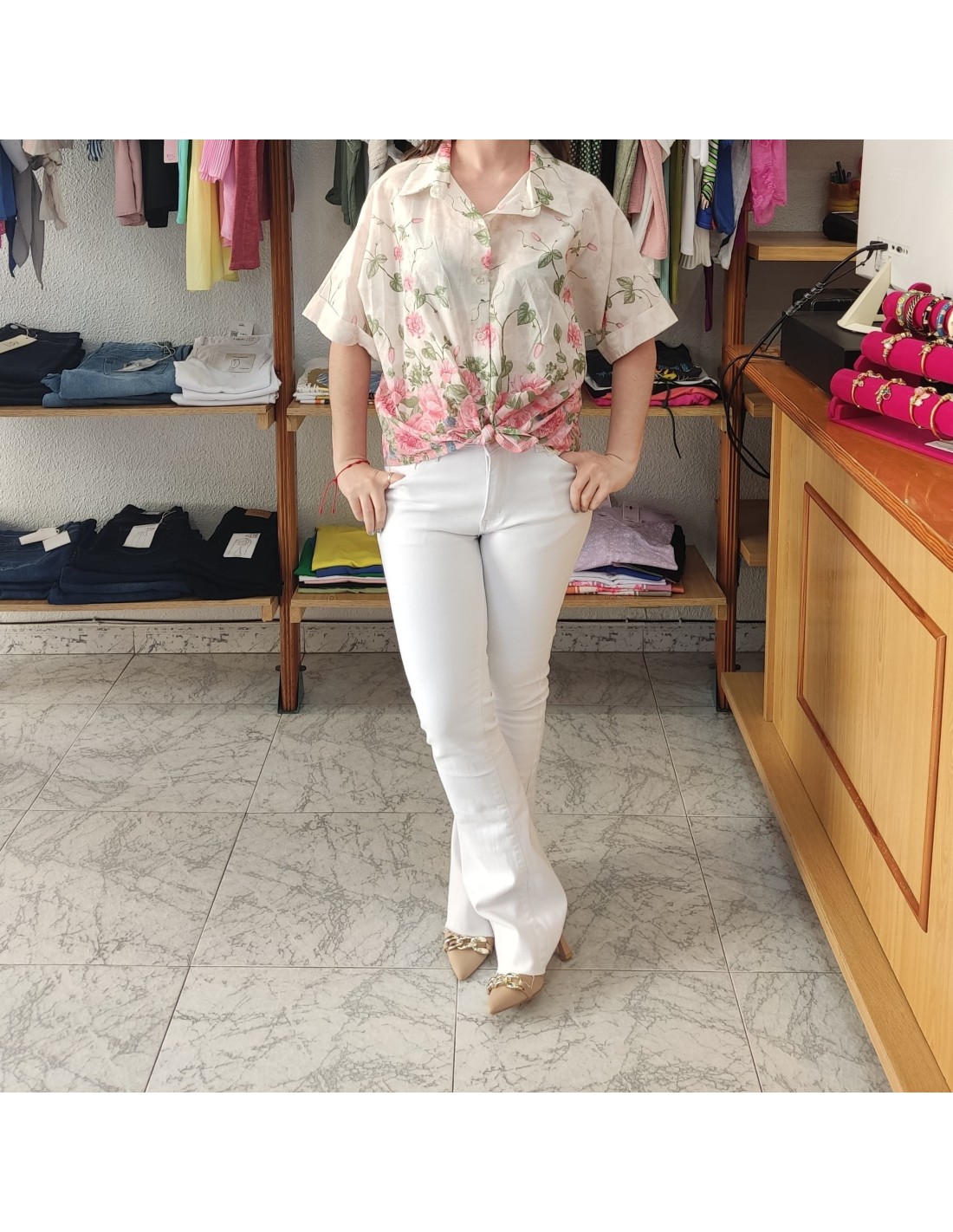 Camisa de tejido de algodón, manga corta con estampado floral en tonos tierra y toque de color. Es una camisa ligera y cómoda, muy fácil de combinar con pantalones claros, vaqueros o incluso faldas.