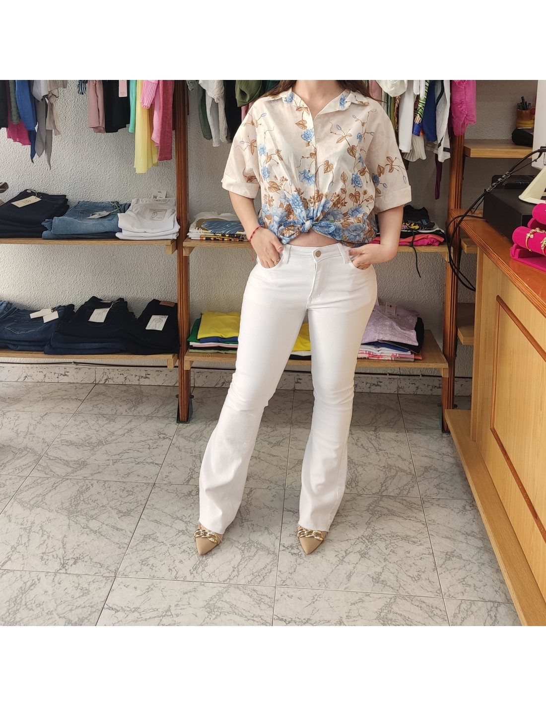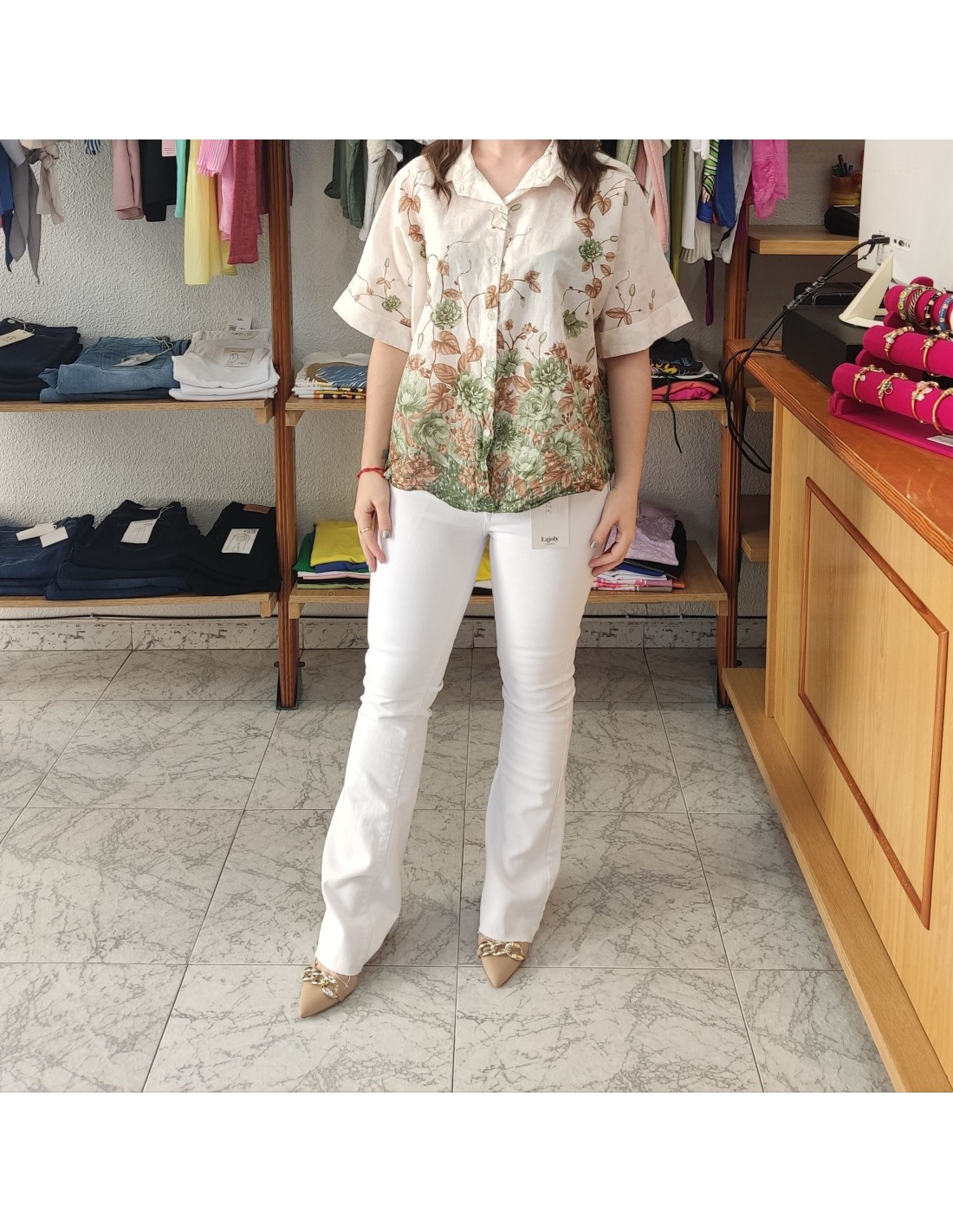 Camisa de tejido de algodón, manga corta con estampado floral en tonos tierra y toque de color. Es una camisa ligera y cómoda, muy fácil de combinar con pantalones claros, vaqueros o incluso faldas.