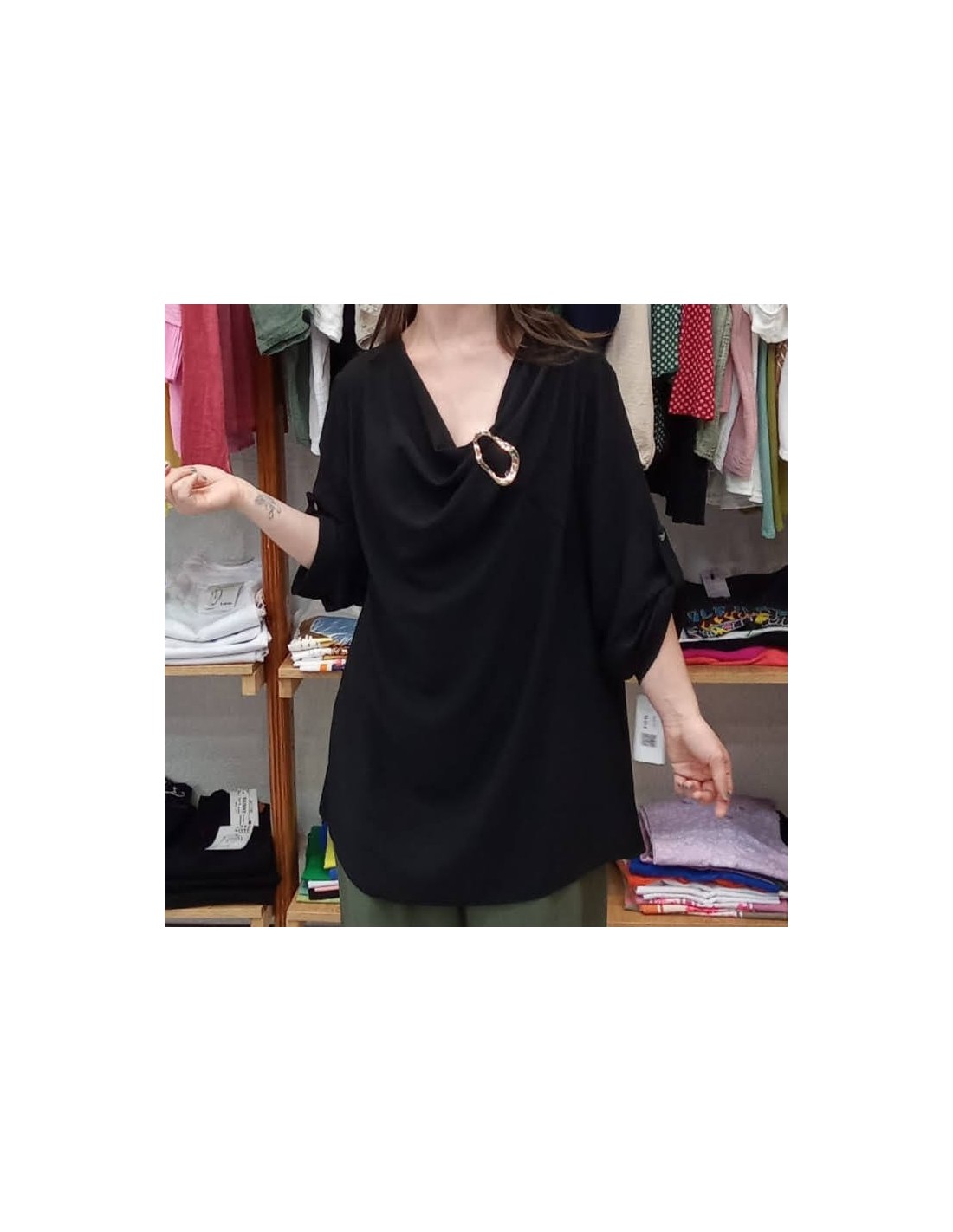 Blusa de talla grande, con escote drapeado con detalle de broche en la zona del pecho, manga larga con opción a manga 3/4. Es una blusa de poliéster, en colores básicos y fáciles de combinar.