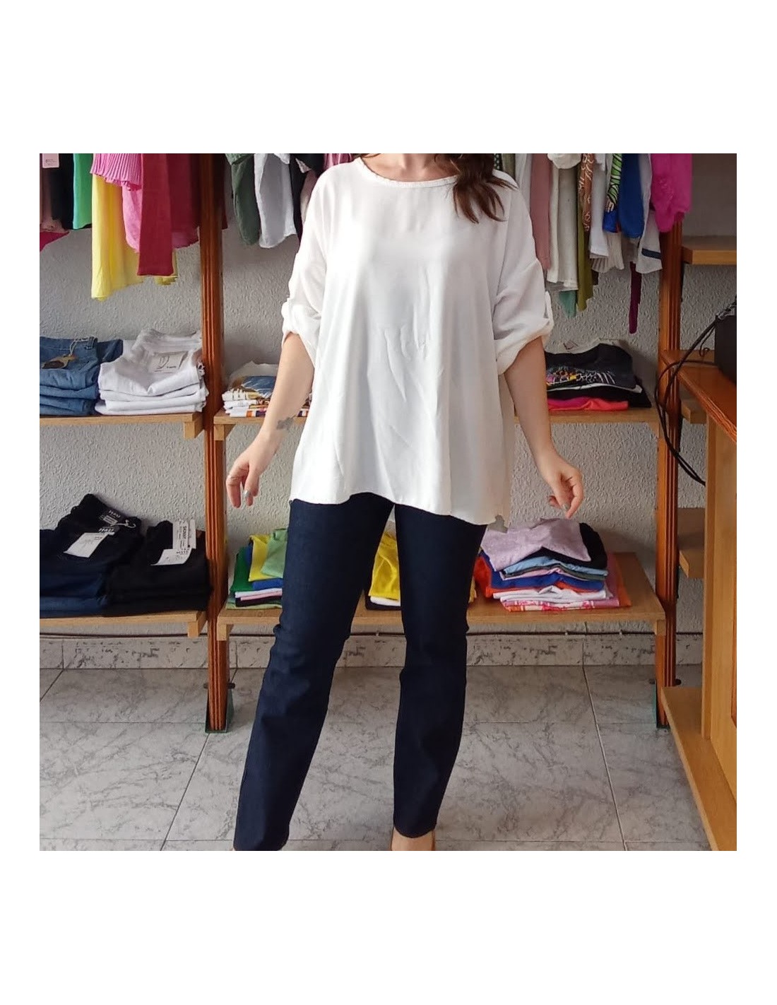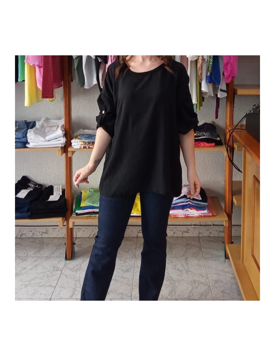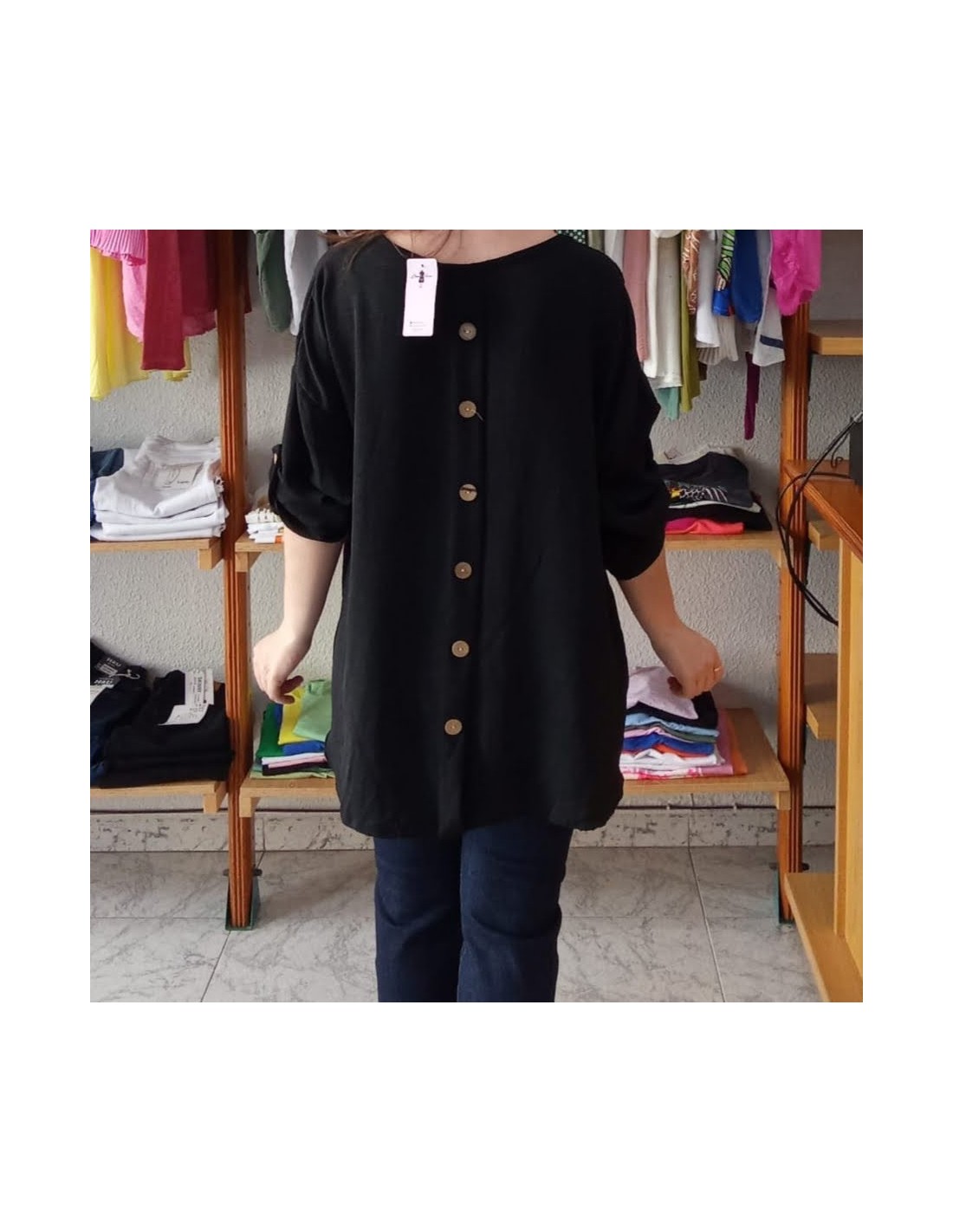 Blusa de corte holgado, manga larga con opción a manga 3/4. Tiene cuello redondo y la característica más distintiva es una hilera vertical de botones de efecto madera en la espalda. Blusa en colores lisos y básicos fáciles de combinar.