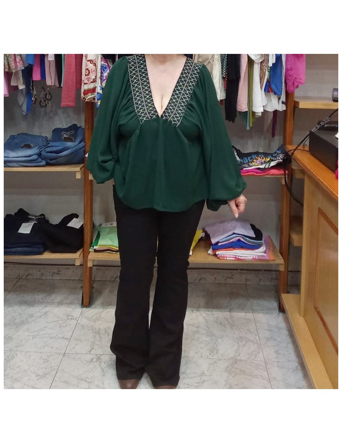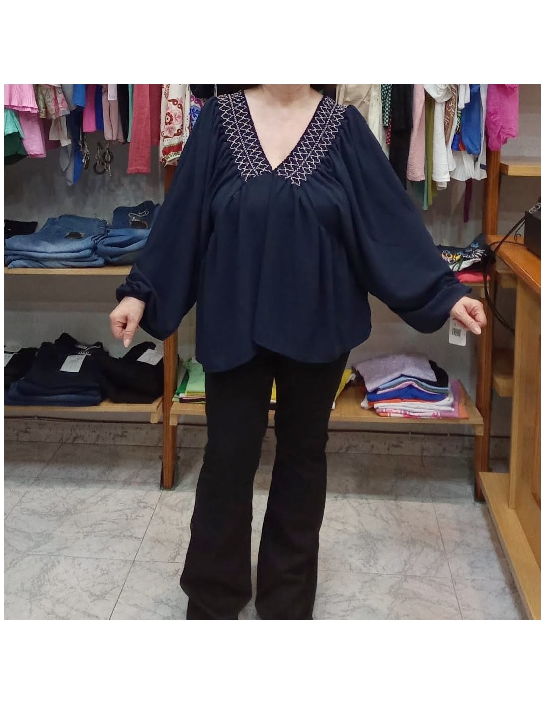 Blusa de corte holgado y relajado, de estilo boho, con un ligero fruncido tanto en la parte delantera como trasera, que le da volumen y un ajuste cómodo. Escote y espalda en V con fruncido elástico en el borde y tiene un patrón decorativo. Las mangas son largas y amplias con estilo abullonado.