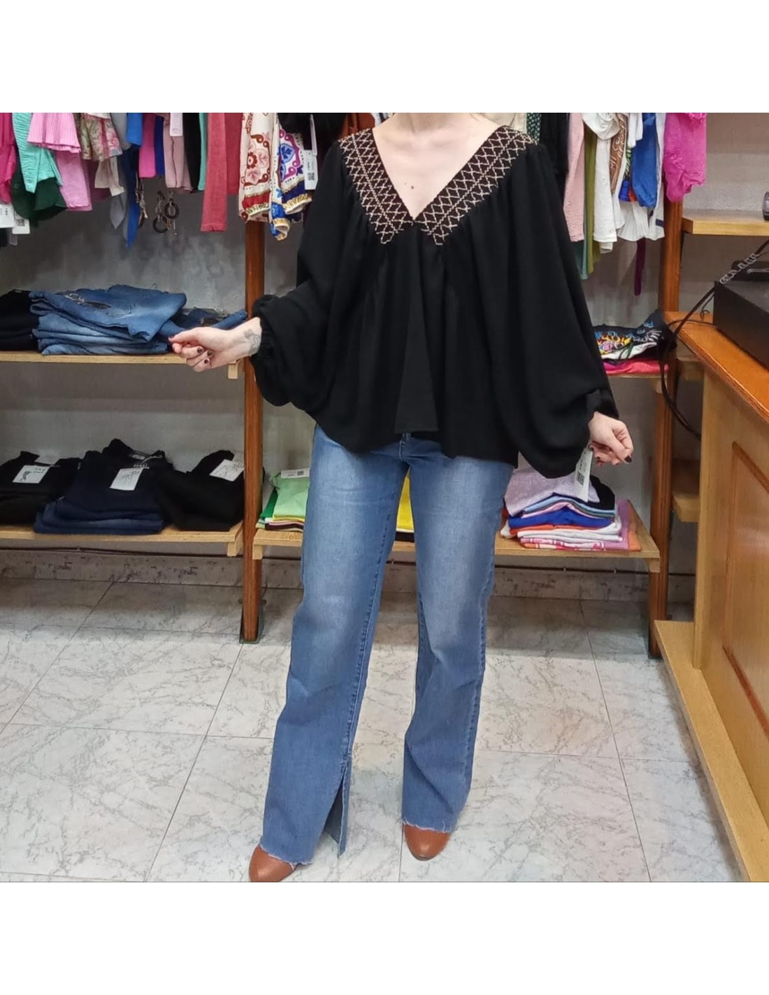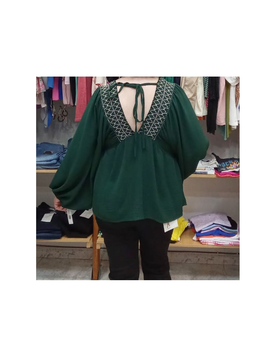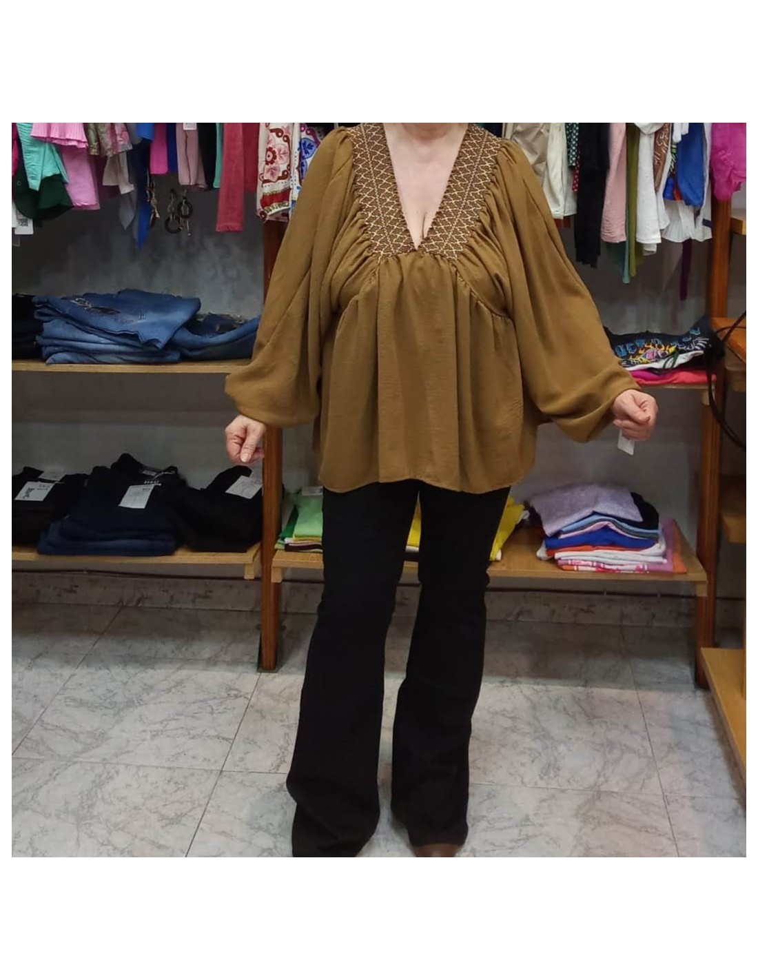 Blusa de corte holgado y relajado, de estilo boho, con un ligero fruncido tanto en la parte delantera como trasera, que le da volumen y un ajuste cómodo. Escote y espalda en V con fruncido elástico en el borde y tiene un patrón decorativo. Las mangas son largas y amplias con estilo abullonado.