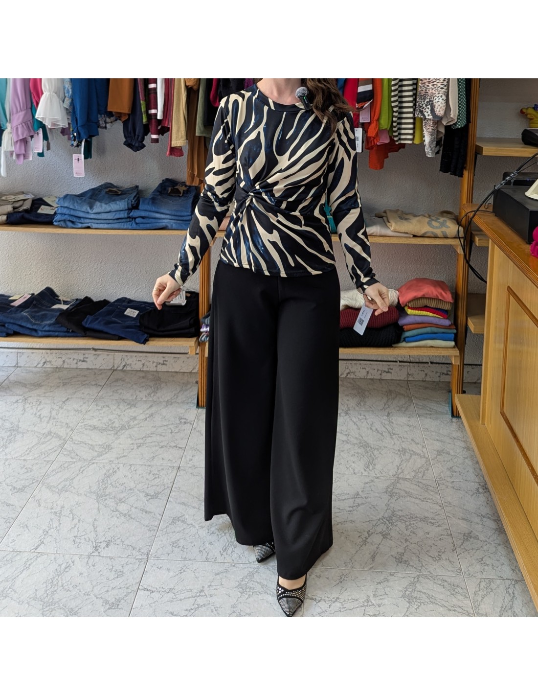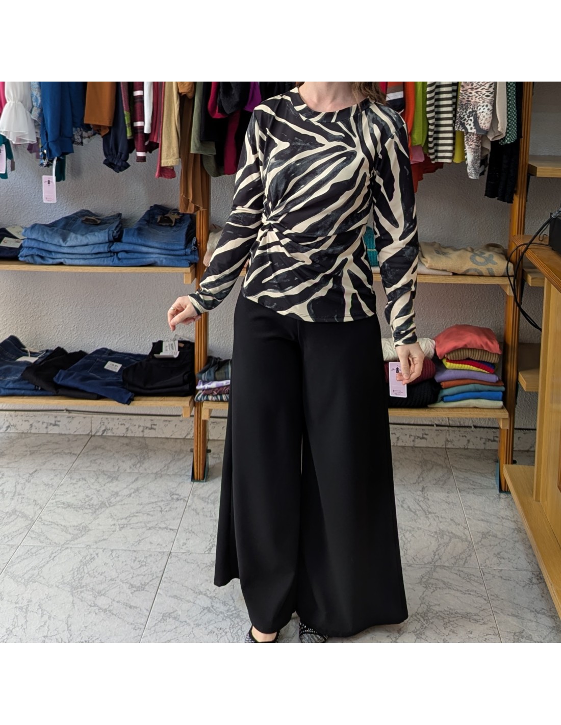 Blusa de vestir, de manga larga, con escote redondo y un detalle fruncido en la parte delantera a la altura de la cintura, lo que le da una forma ajustada y favorecedora. Estampado de cebra en colores combinados. De tejido ligero y elástico.