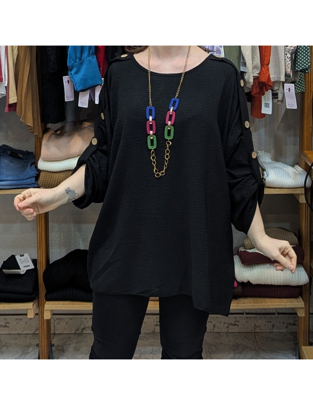 Blusa de talla grande, es una blusa sencilla y ligera, es de manga larga con opción a manga 3/4, de escote redondo y tiene detalle de botones efecto madera desde el hombro hasta la mitad del brazo. Una blusa disponible en colores básicos y combinables.