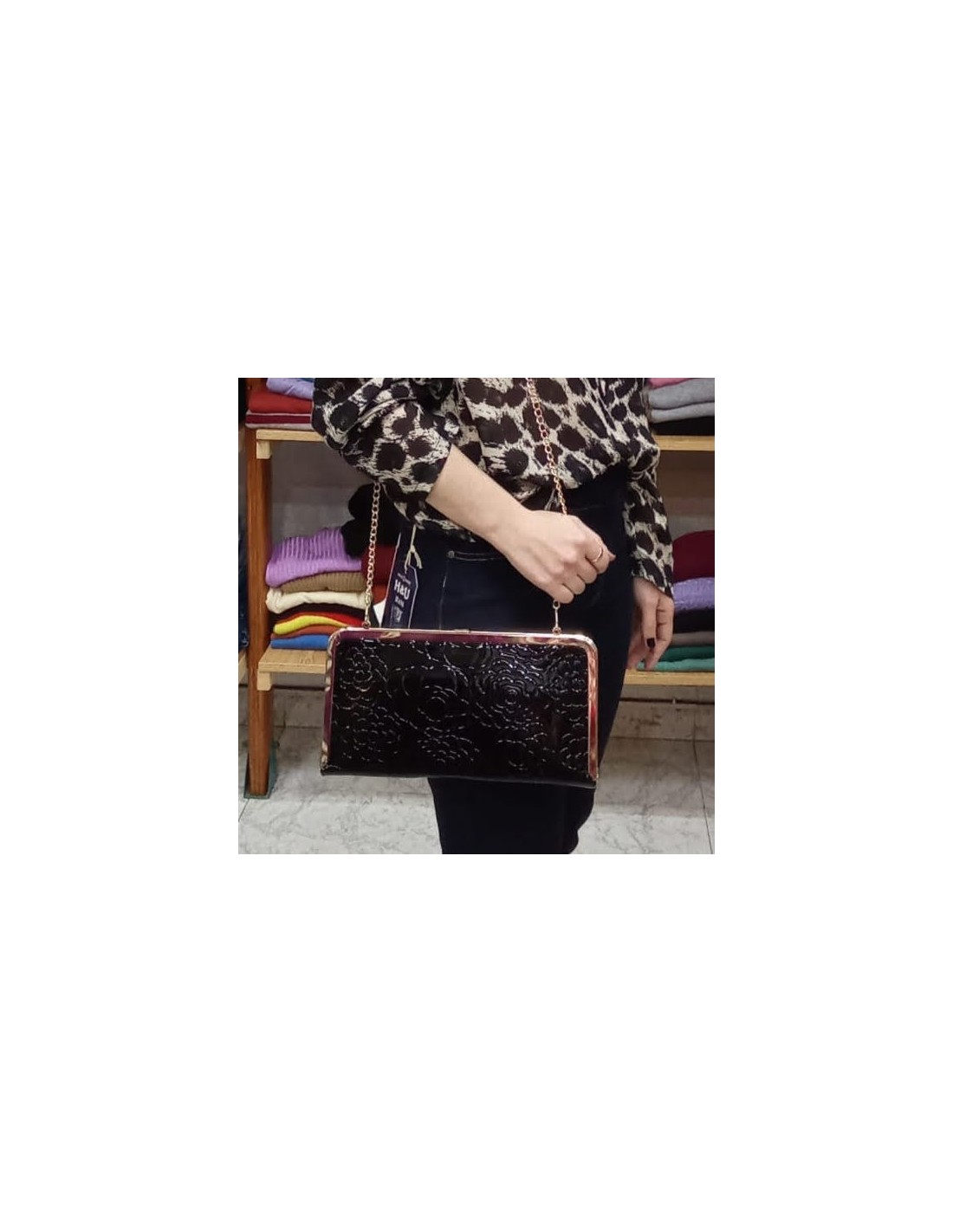 La elegancia personificada en nuestro impresionante bolso, modelo Clutch de tamaño grande. Confeccionado en un lujoso charol, con grabado floral, este accesorio es la elección perfecta para quienes buscan añadir un toque de glamour a cualquier outfit.