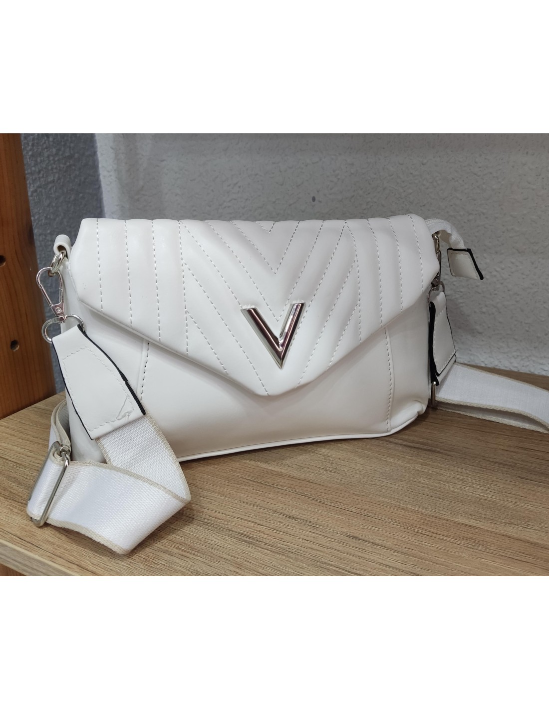 Bolso de tamaño mediano/pequeño en color blanco, es un bolso blando, de diseño simple y moderno, capacidad interior, cierre de cremallera y click en la solapa, dispone de correa larga y ancha.
