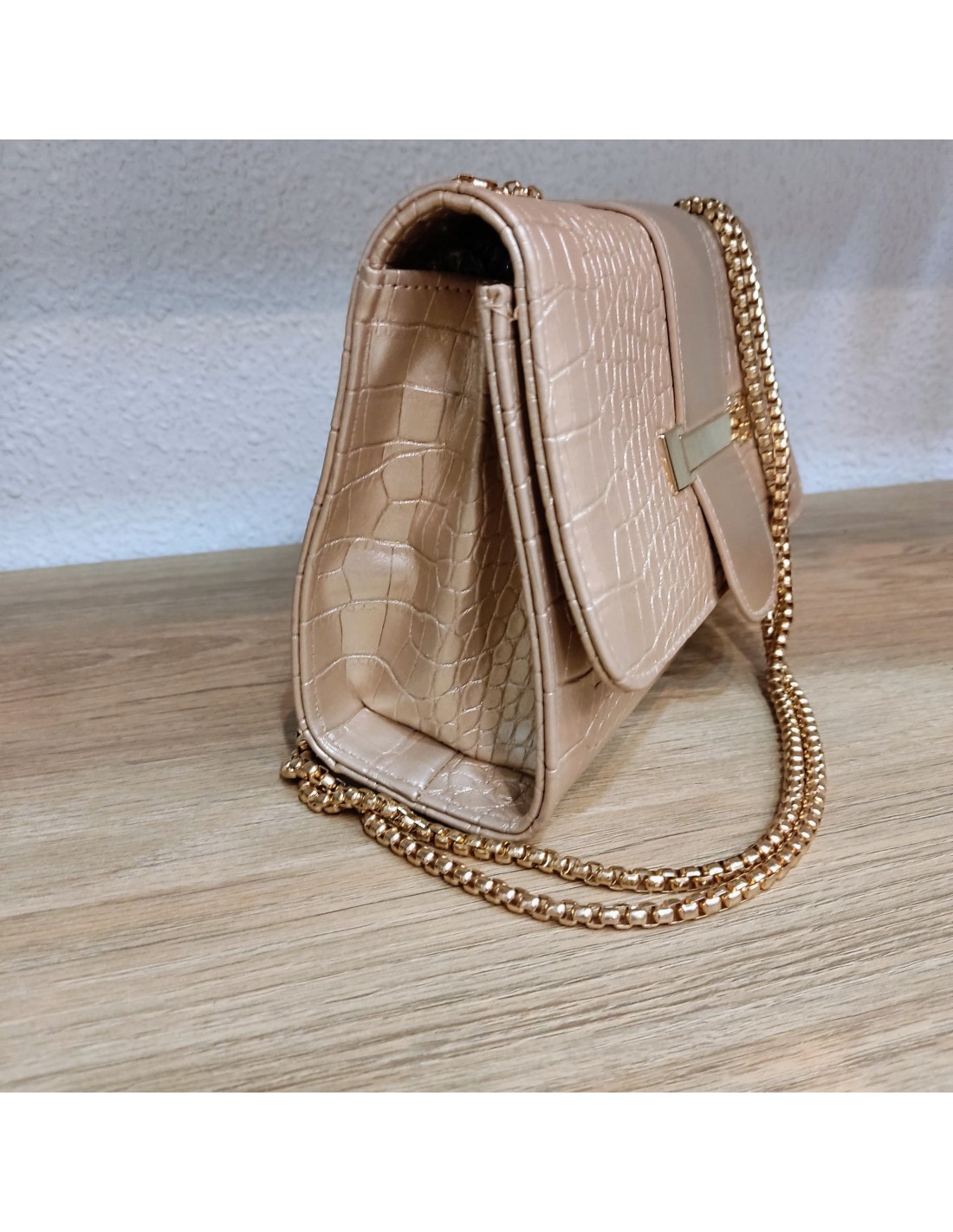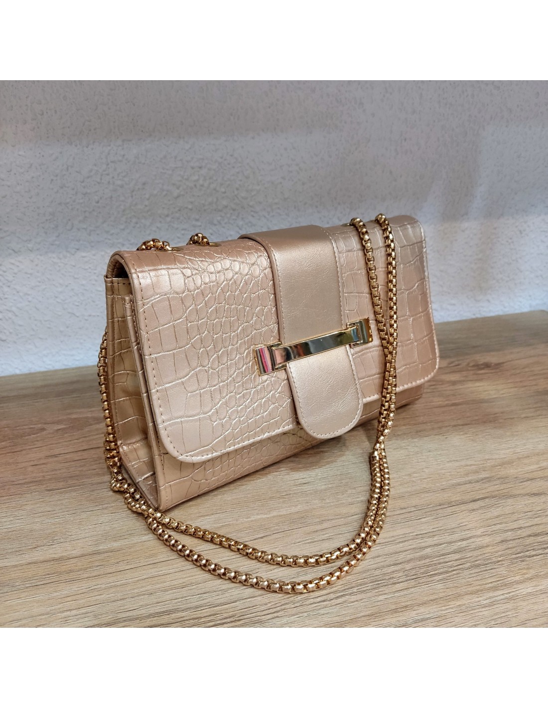 Bolso de color champagne con textura que simula la piel de cocodrilo. Tiene forma rectangular y un cierre metálico dorado en la parte frontal de la solapa. Cadena metálica que puede llevarse doble.