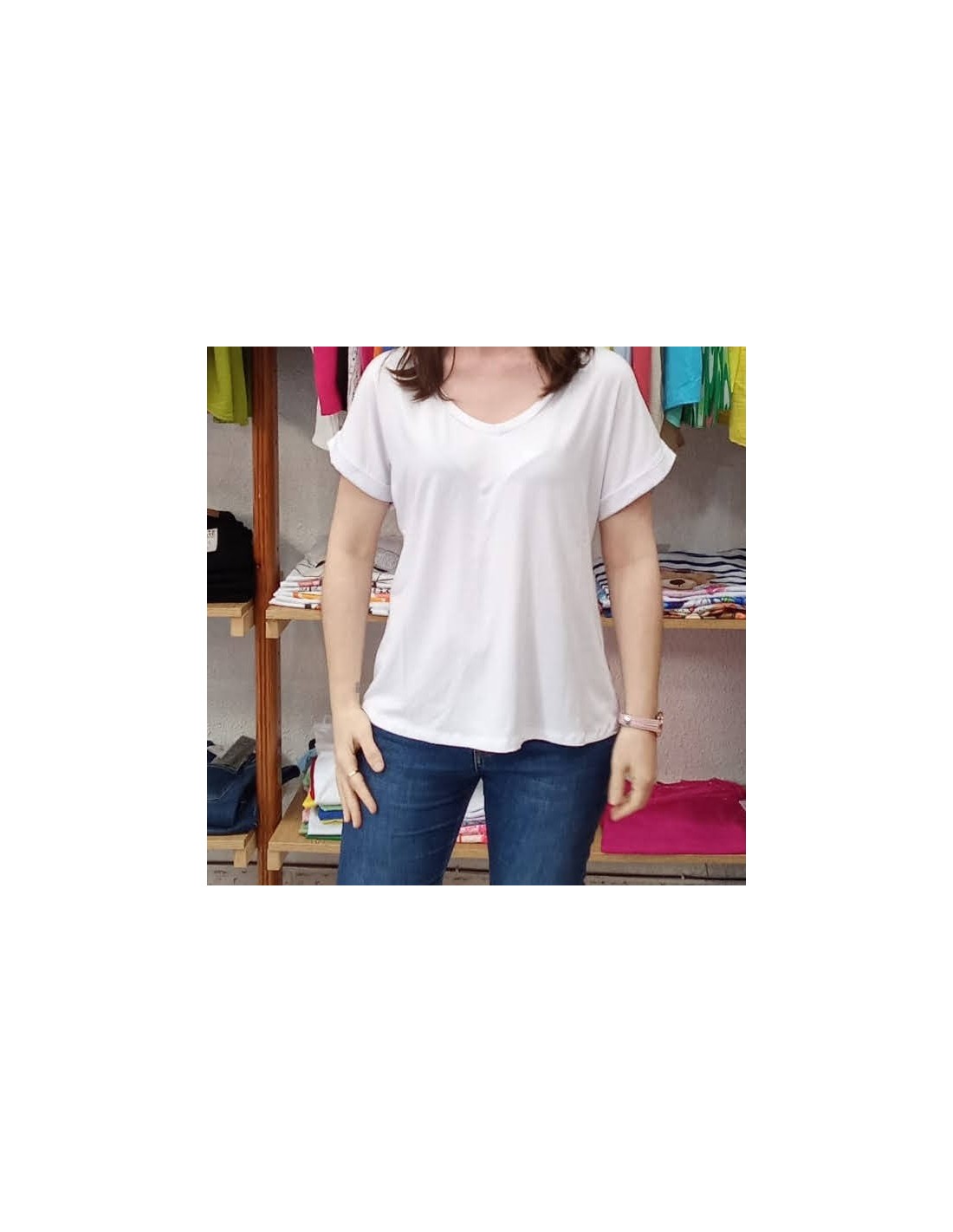 Camiseta básica de mujer, de manga corta con vuelta y escote en pico. Su corte ligeramente holgado favorece a todo tipo de siluetas. Disponible en varios colores. Tejido suave, fresco y cómodo.