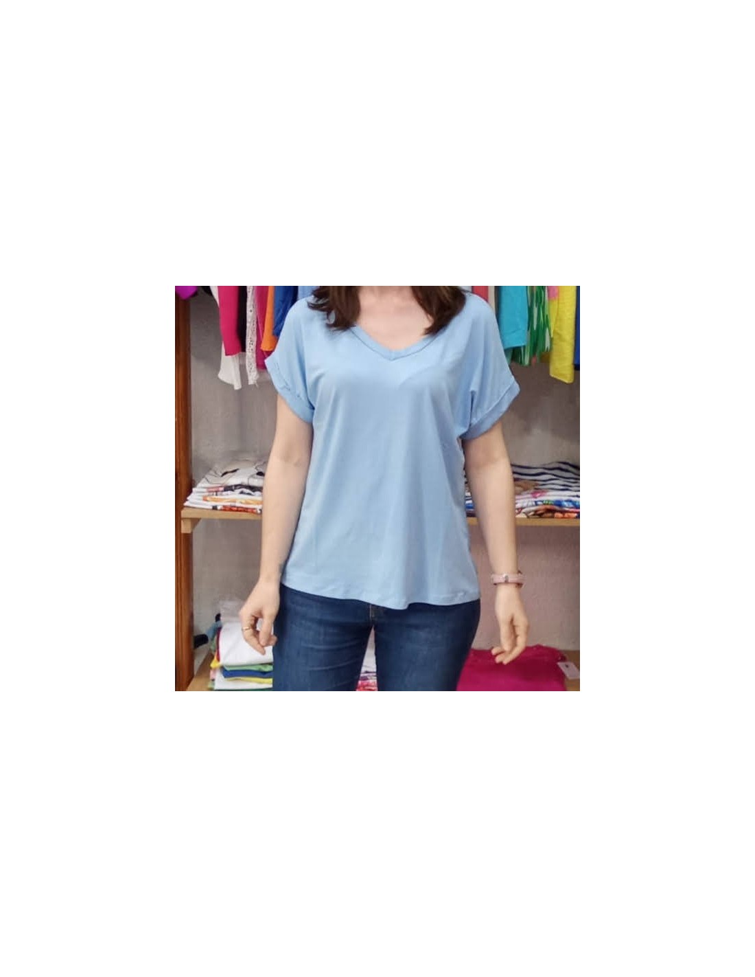 Camiseta básica de mujer, de manga corta con vuelta y escote en pico. Su corte ligeramente holgado favorece a todo tipo de siluetas. Disponible en varios colores. Tejido suave, fresco y cómodo.