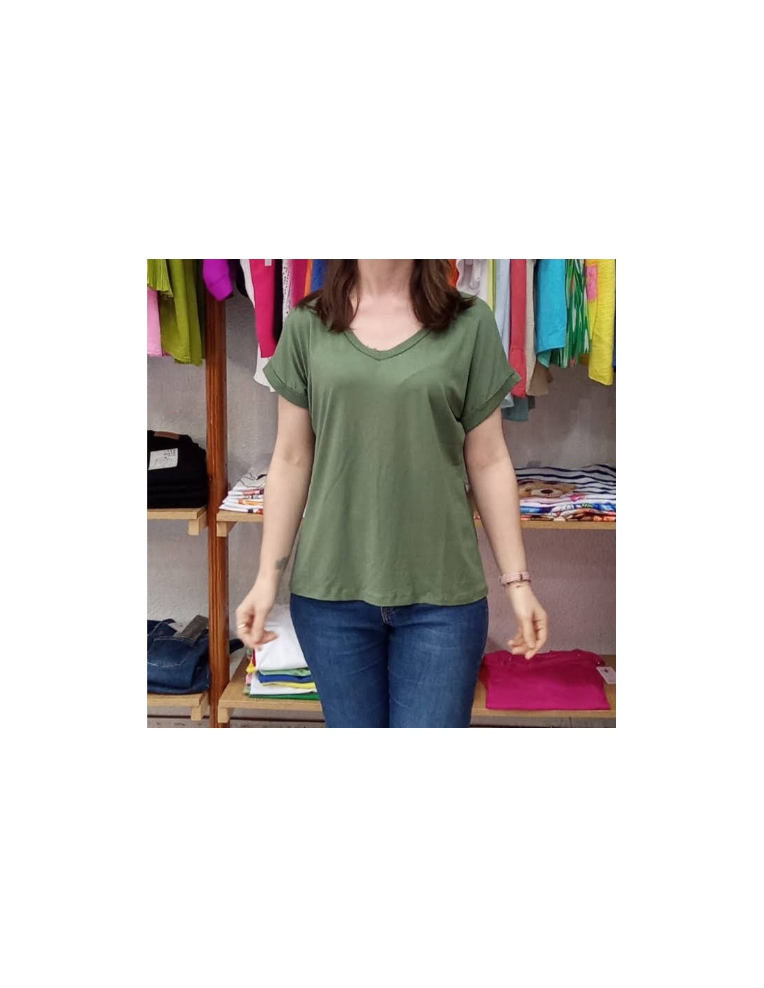 Camiseta básica de mujer, de manga corta con vuelta y escote en pico. Su corte ligeramente holgado favorece a todo tipo de siluetas. Disponible en varios colores. Tejido suave, fresco y cómodo.