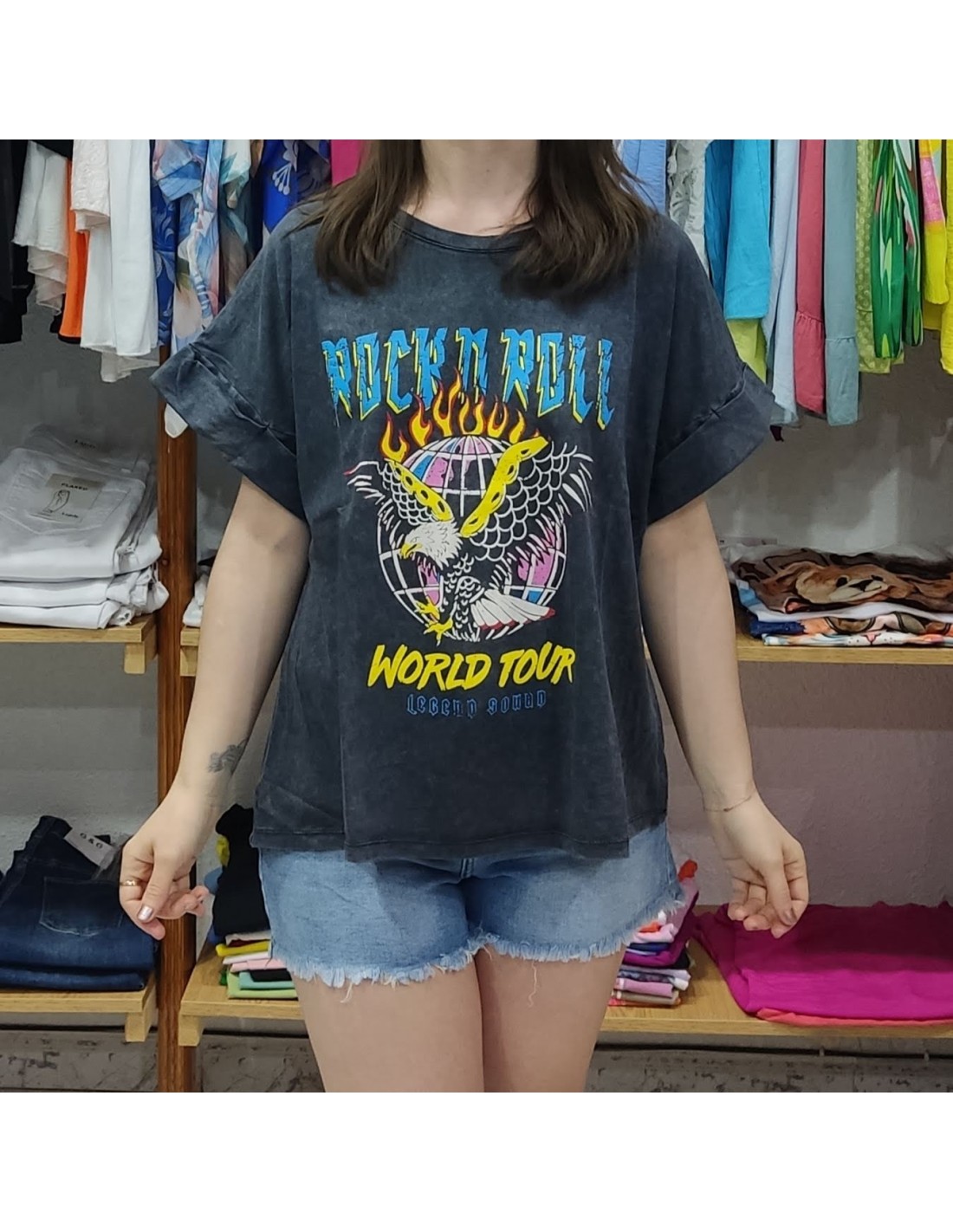 Camiseta de algodón, de corte holgado, manga corta con escote redondo y dobladillo en las mangas, estampado bonito. Color gris a la piedra.