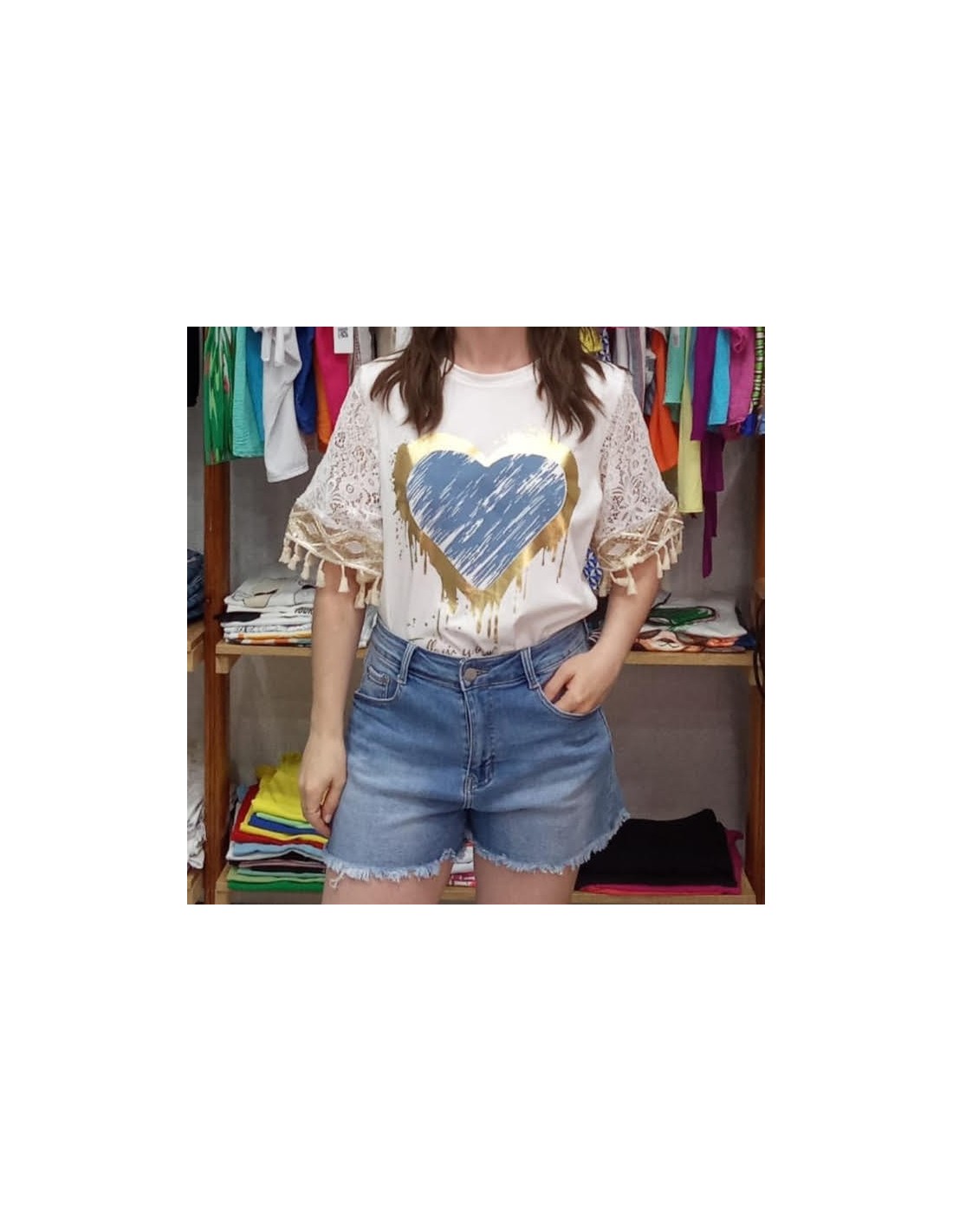 Camiseta blanca de algodón con un gran corazón en la parte central con marco dorado con efecto pincelado. Mangas de encaje, lentejuelas doradas y borlas, que la hace muy femenina y delicada.