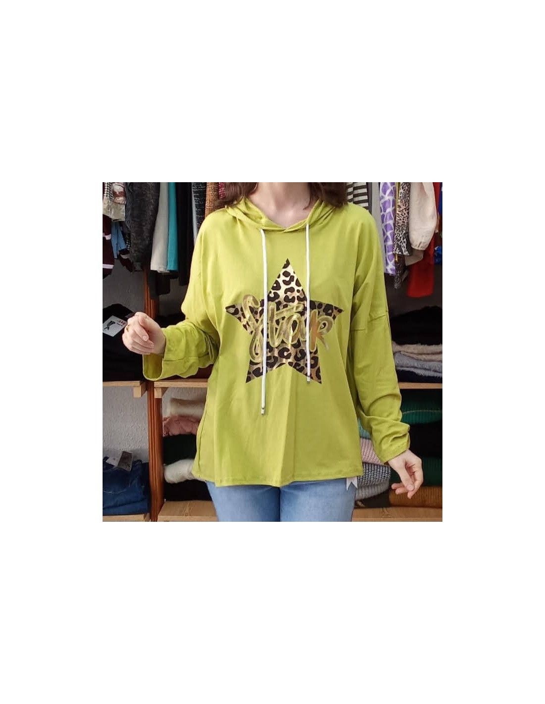 Sudadera de corte holgado, manga caída y lleva capucha, es elástica, ligera, cómoda y con mucho estilo. Estampado bonito.