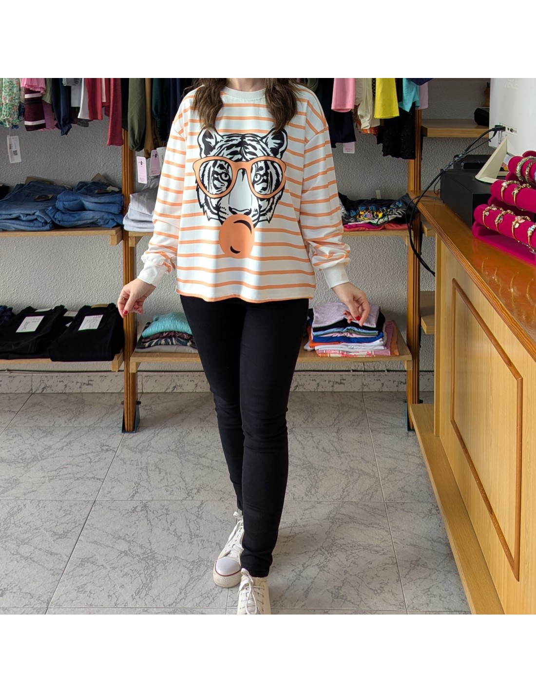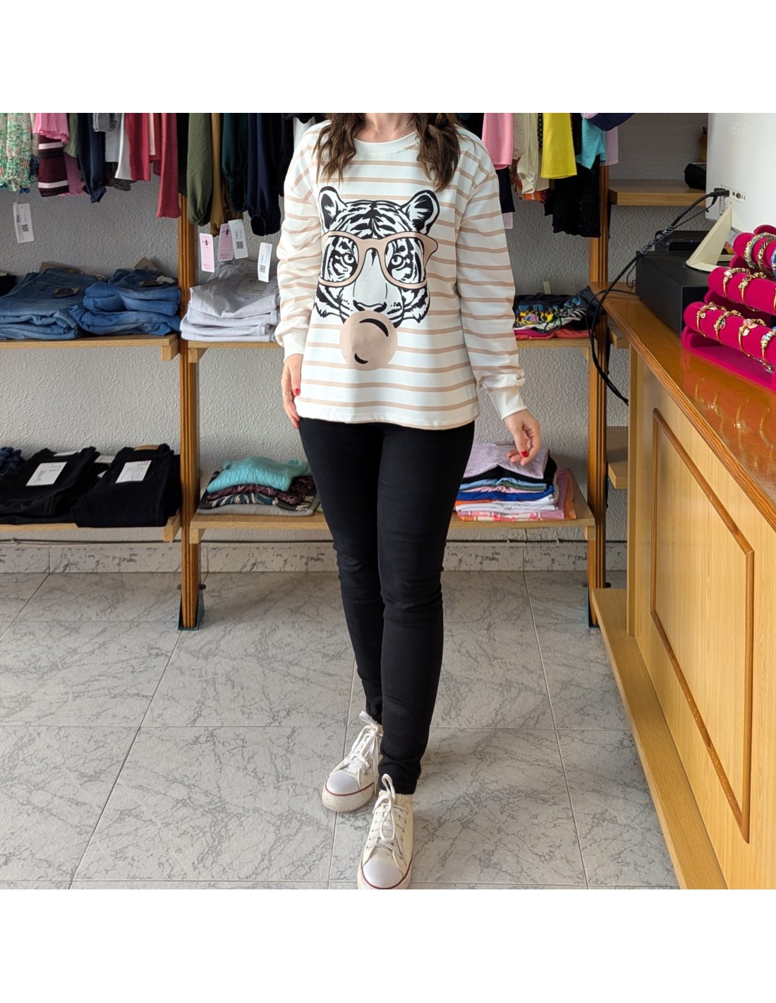Sudadera de algodón, cuello redondo, puños y cuello elásticos. Estampado combinado con un dibujo  de tigre divertido y original acompañado de rayas. Es una sudadera muy suave y cómoda perfecta para el entretiempo.