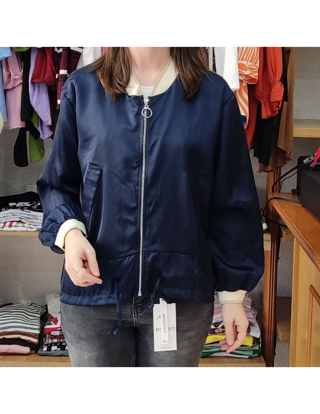 De tejido ligero y tacto suave, en color solido y de tela satinada. Corte clásico, cierre frontal con cremallera, falsos bolsillos en la parte frontal, puños y cuello elásticos con ribete dorado.