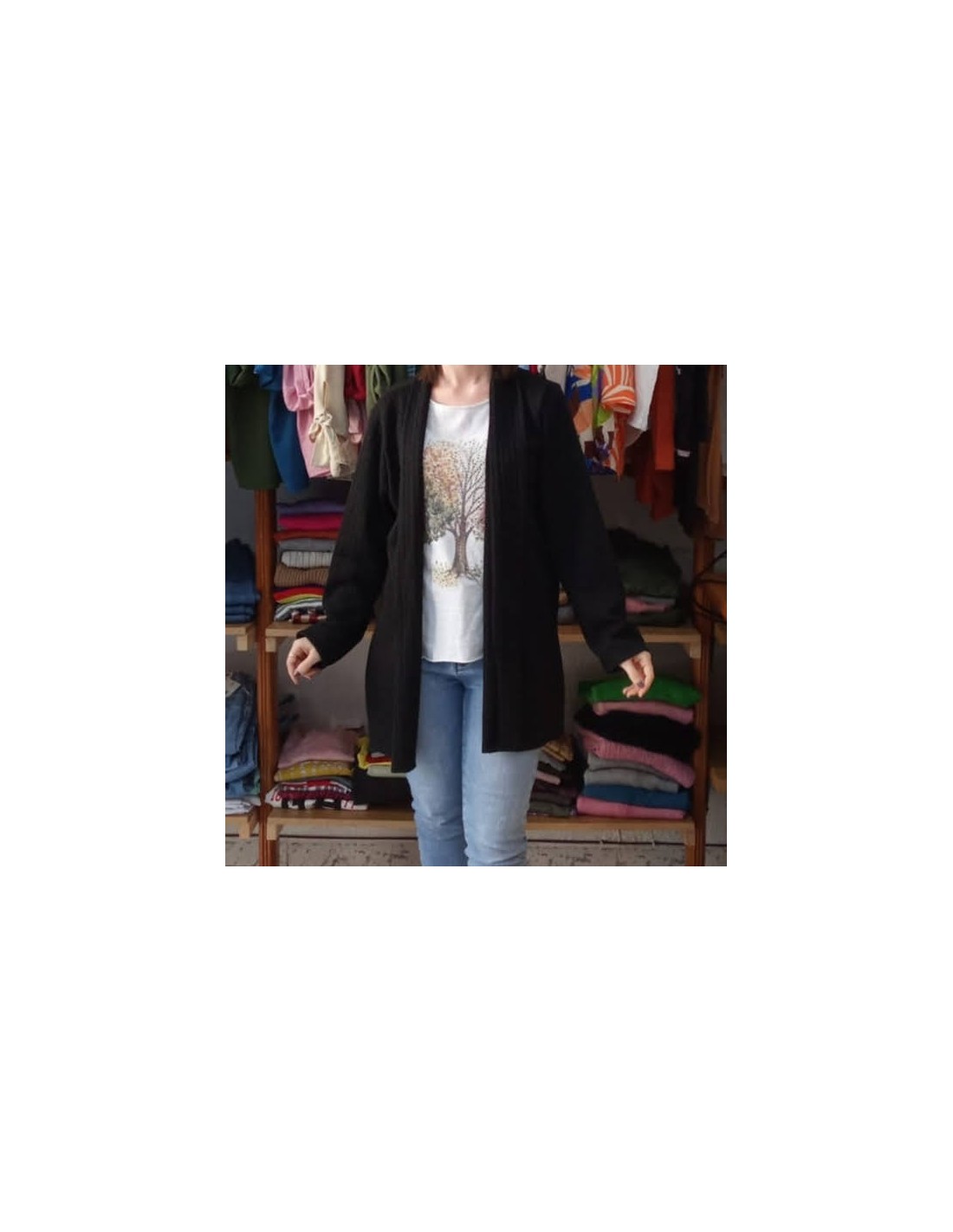 Chaqueta larga de lana suave y cálida, es abierta, con un hermoso dibujo en toda la prenda que le añade un toque texturizado. Chaqueta ideal para tus looks desde el casual hasta el más sofisticado.