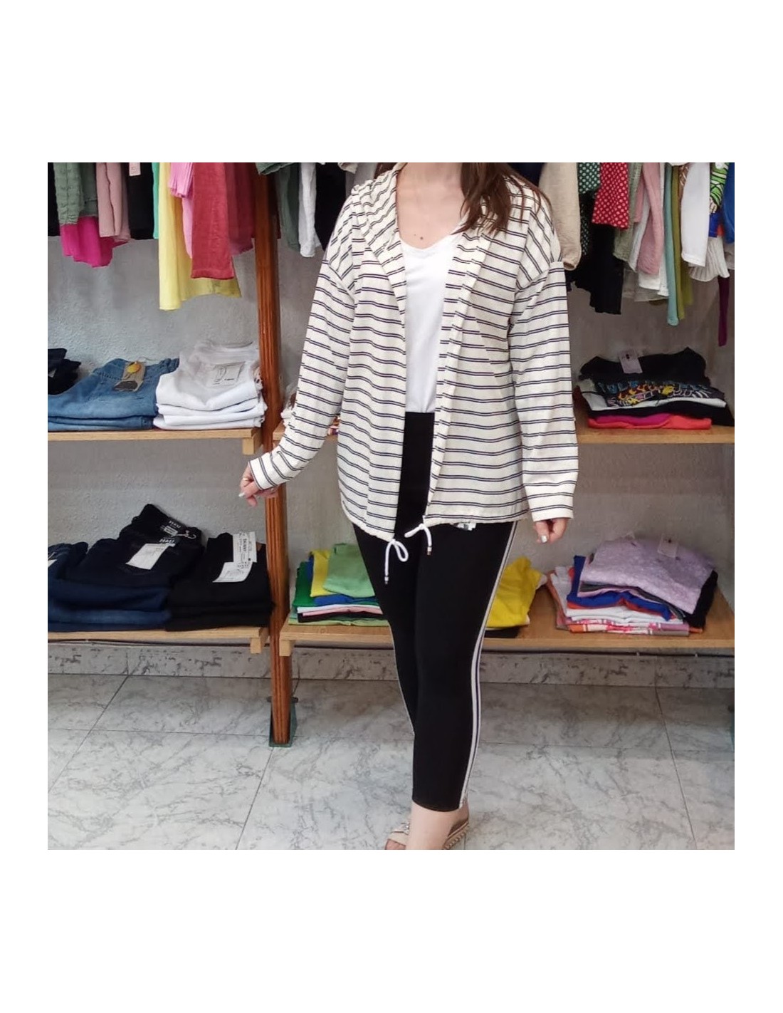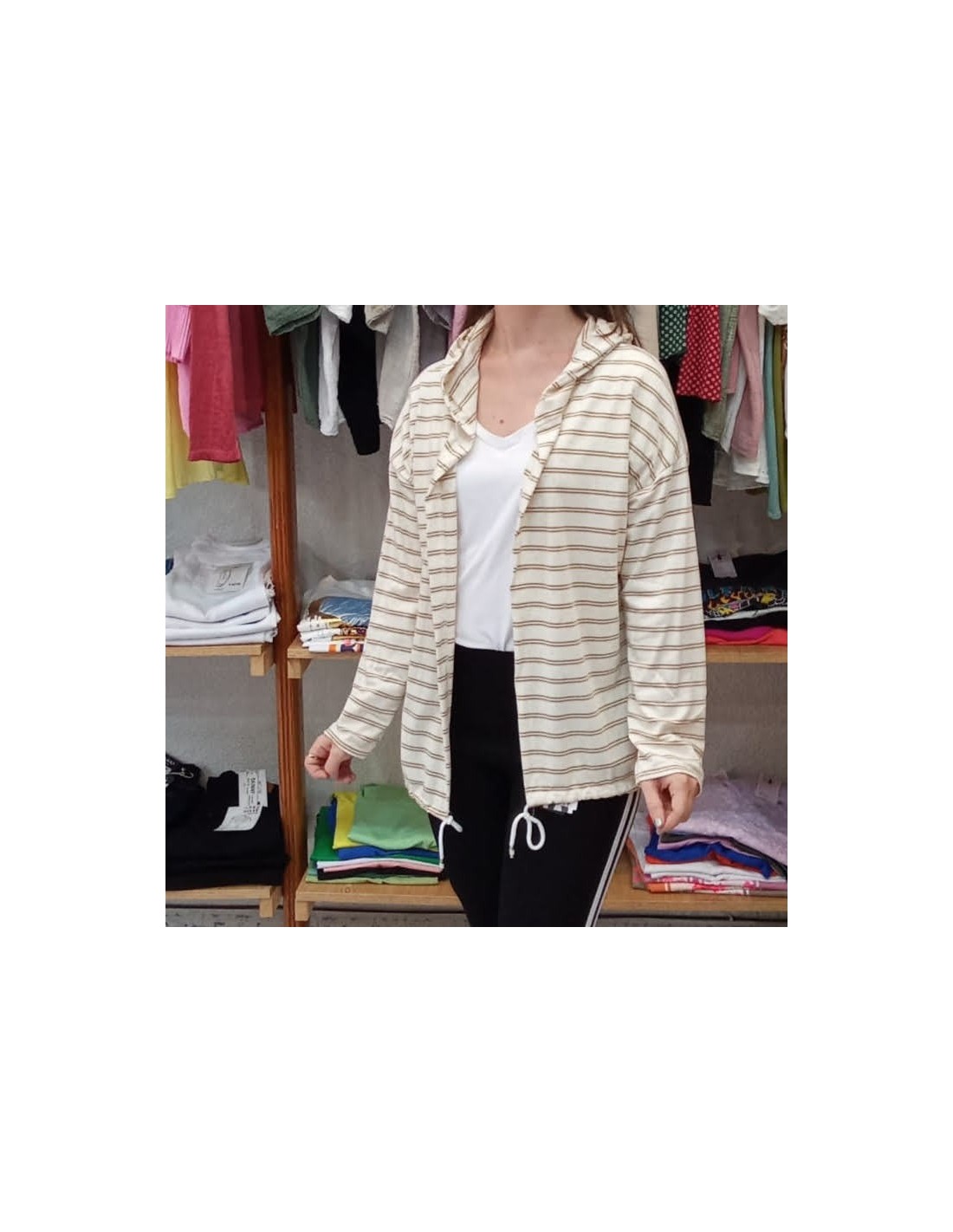 Chaqueta de punto, mezcla de algodón y lino, de estilo abierto, sin cierre manga larga y capucha y detalle de cordones ajustables en el bajo. Tiene estampado de rayas.