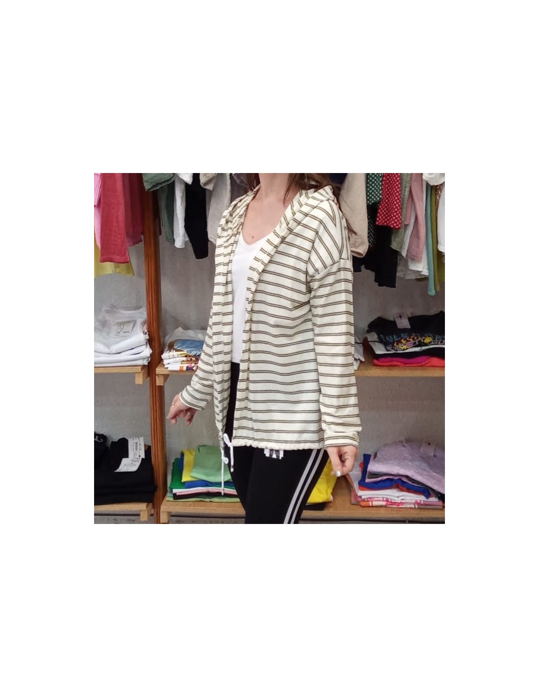 Chaqueta de punto, mezcla de algodón y lino, de estilo abierto, sin cierre manga larga y capucha y detalle de cordones ajustables en el bajo. Tiene estampado de rayas.