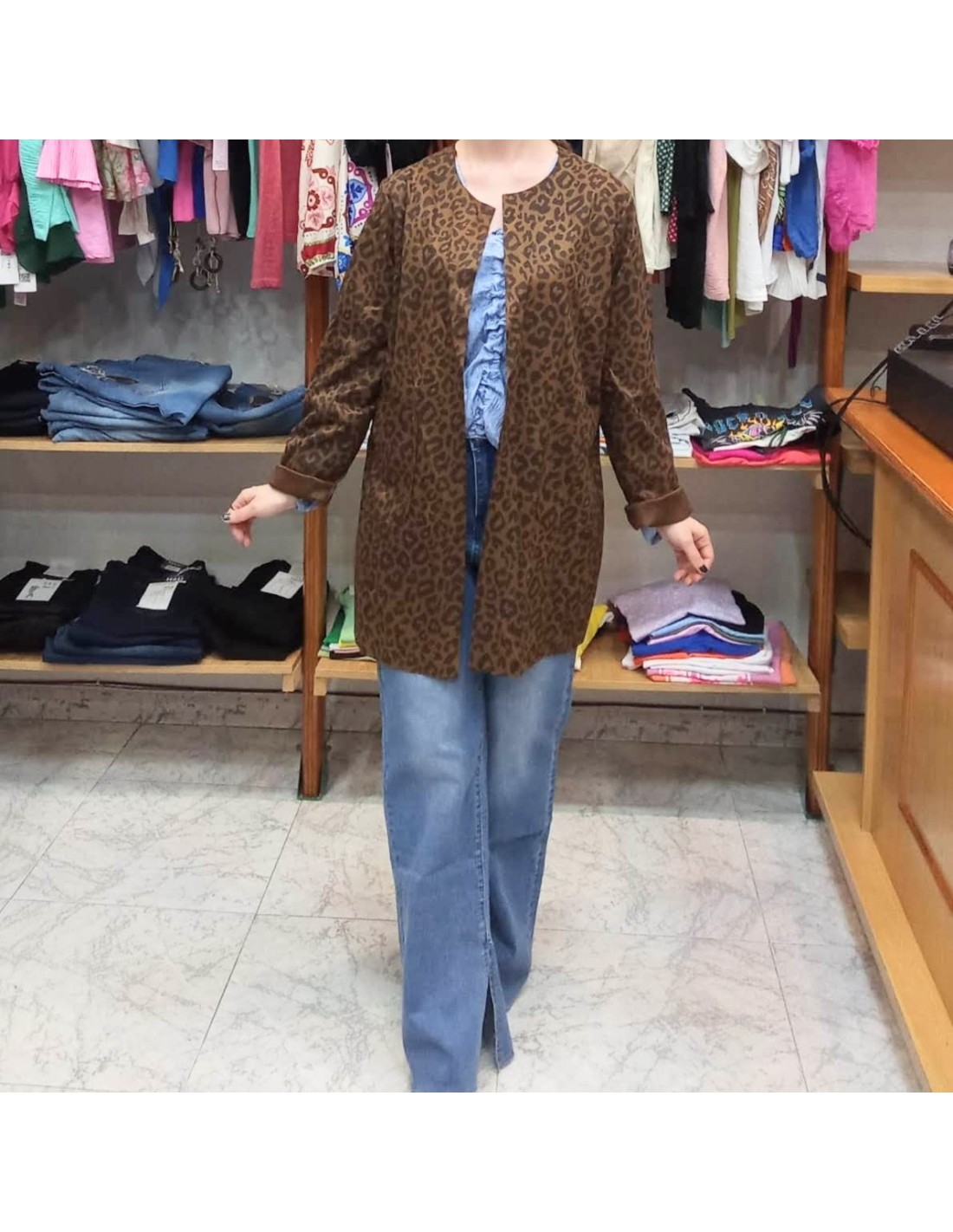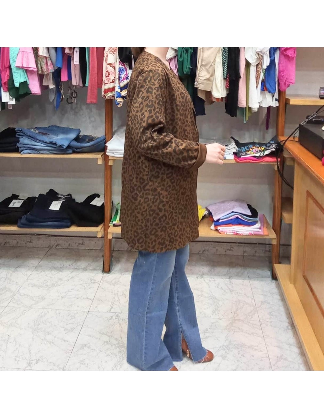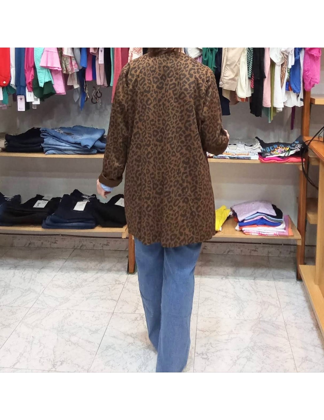 De estampado animal print de leopardo, de corte abierto sin botones ni cierres, con solapas que caen suavemente. Es adecuada para looks casuales.