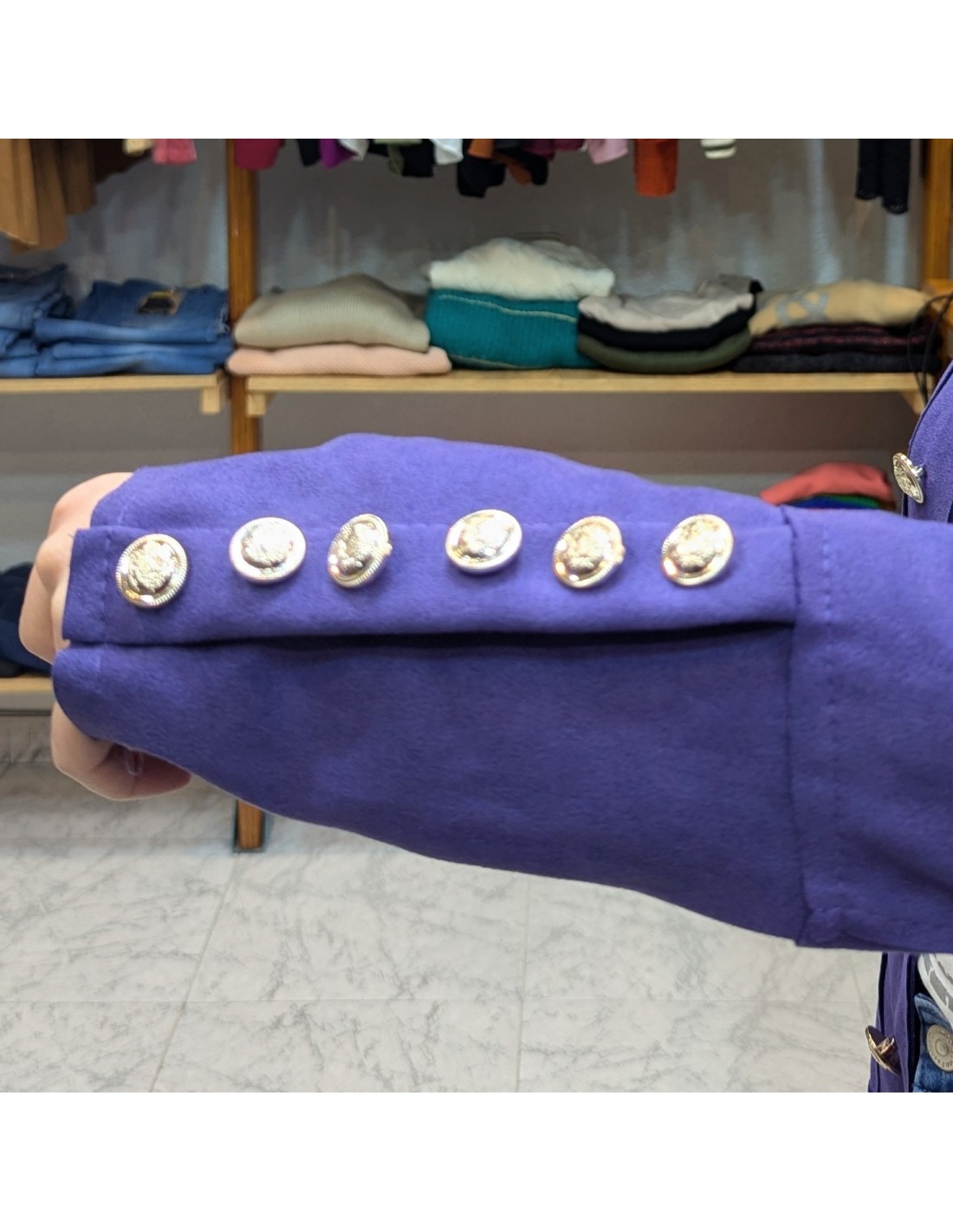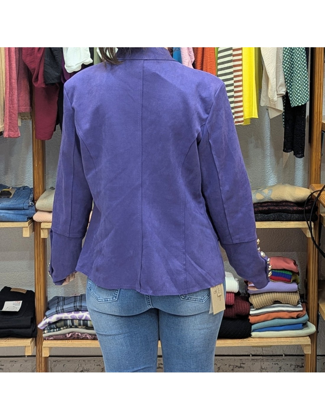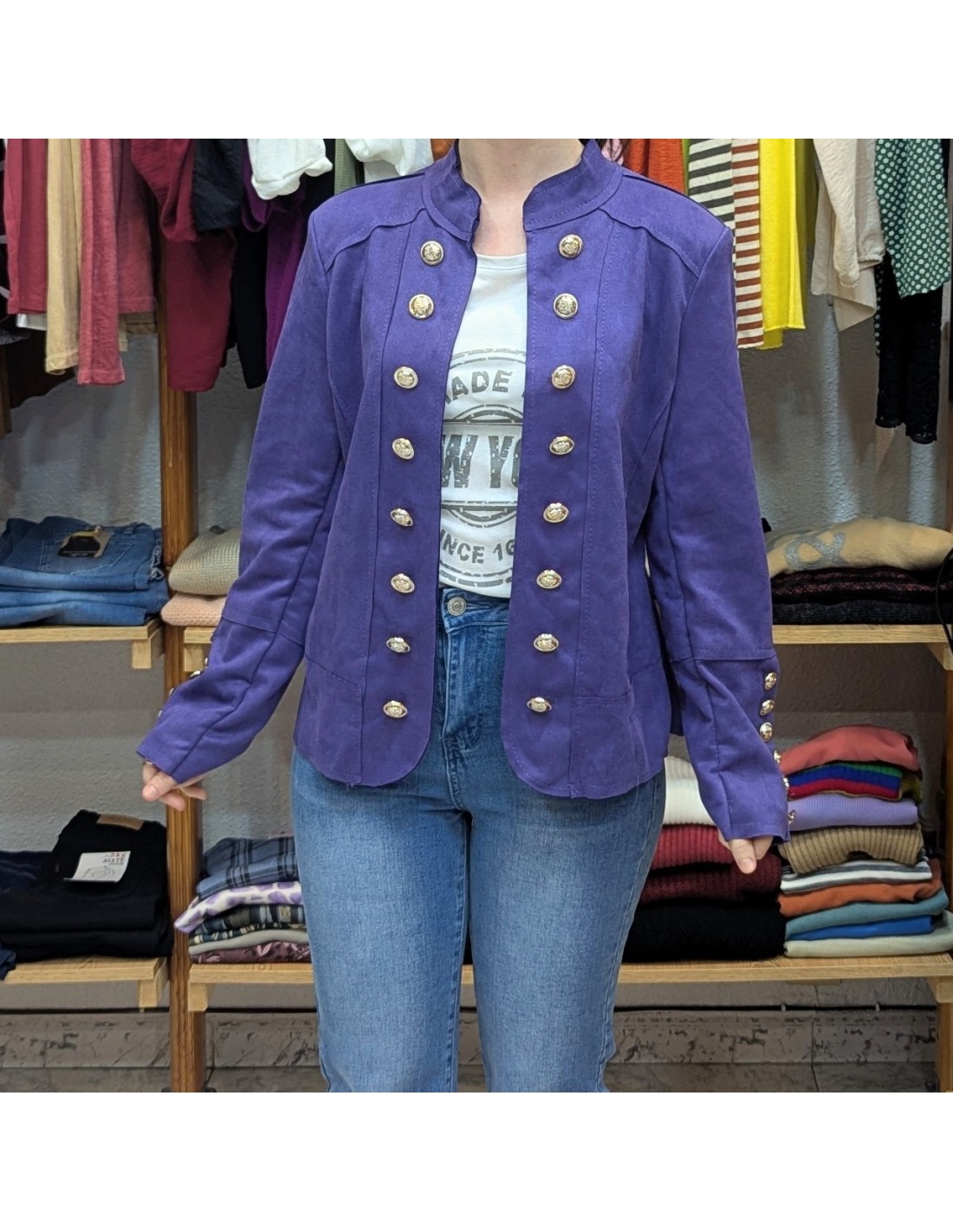 Chaqueta tipo militar en color morado, su diseño estructurado realza la figura y los botones dorado decorativos le dan el toque de distinción, cuello redondo tipo mao, botones delanteros decorativos, tejido de antelina.