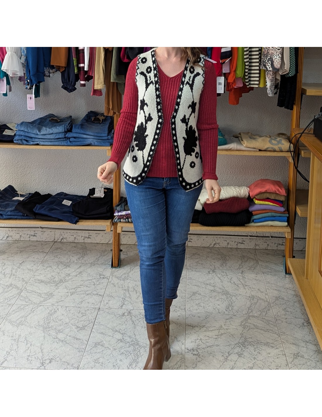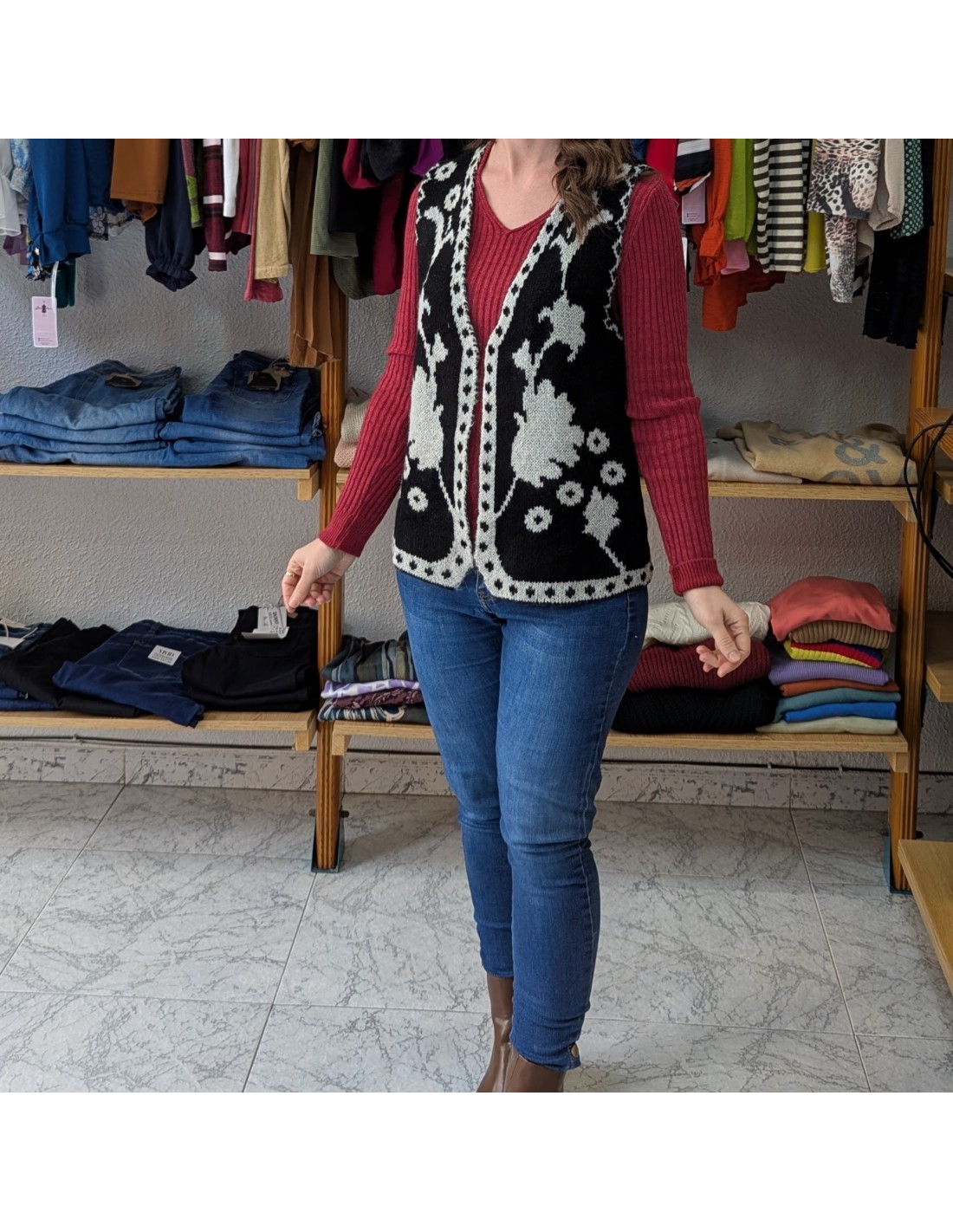 Chaleco de lana de diseño moderno, ideal para combinar con tus looks de otoño/invierno. Tiene un largo hasta la cintura que estiliza la figura y detalles decorativos en la parte frontal que aportan un toque distintivo. Es cómodo, suave y cálido.