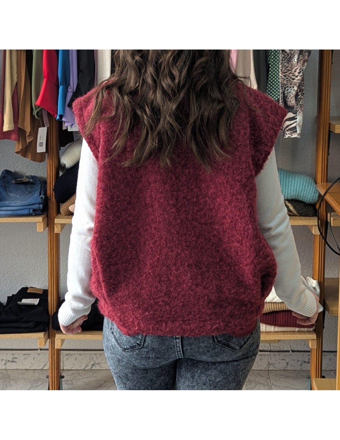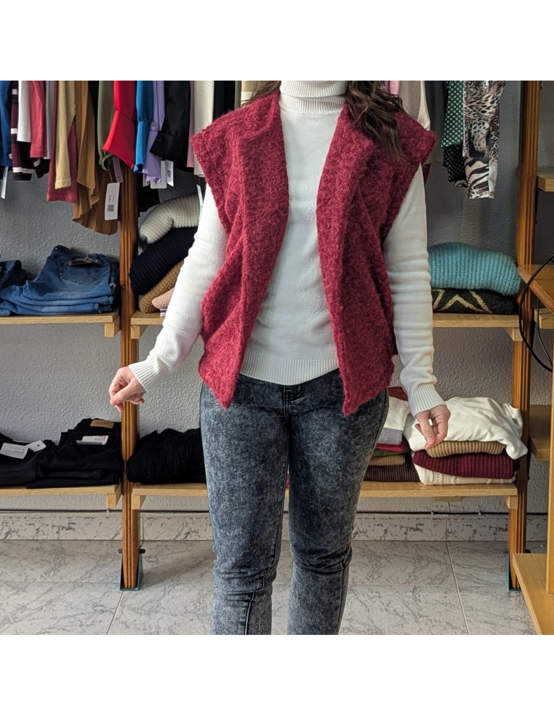 Chaleco de efecto lana, de diseño abierto confeccionado en tejido calentito y ligero. Es ideal para superponer y dar estilo a cualquier look.