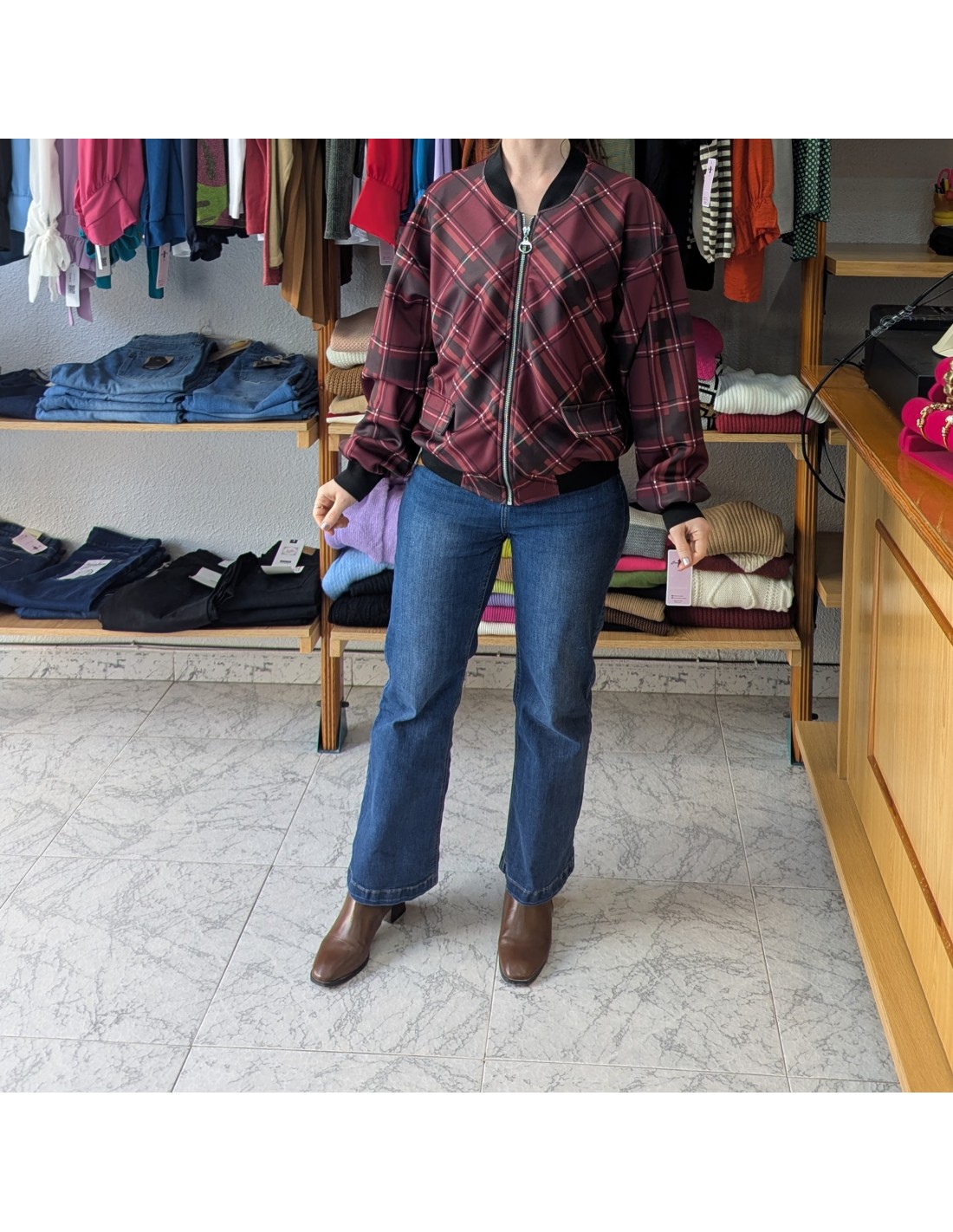 Cazadora Bómber con estampado de cuadros escoceses en tonos burdeos, rojo y negro. Cierre de cremallera frontal, cuello, puños y cintura elástica en color negro.
