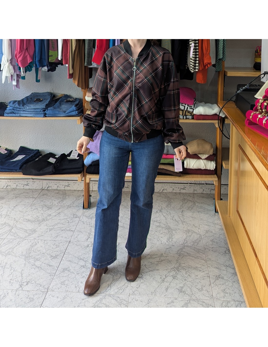 Cazadora Bómber con estampado de cuadros escoceses en tonos negro y marrón. Cierre de cremallera frontal, cuello, puños y cintura elástica en color negro.