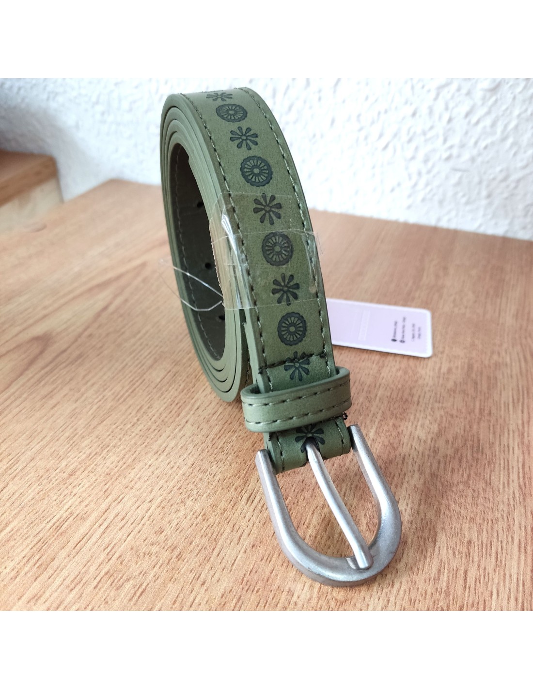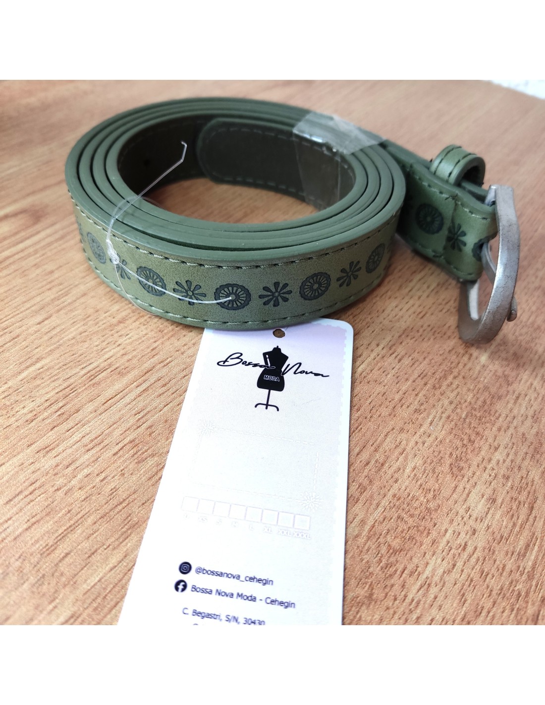Cinturón de hebilla en color verde con grabado. 100 Cm