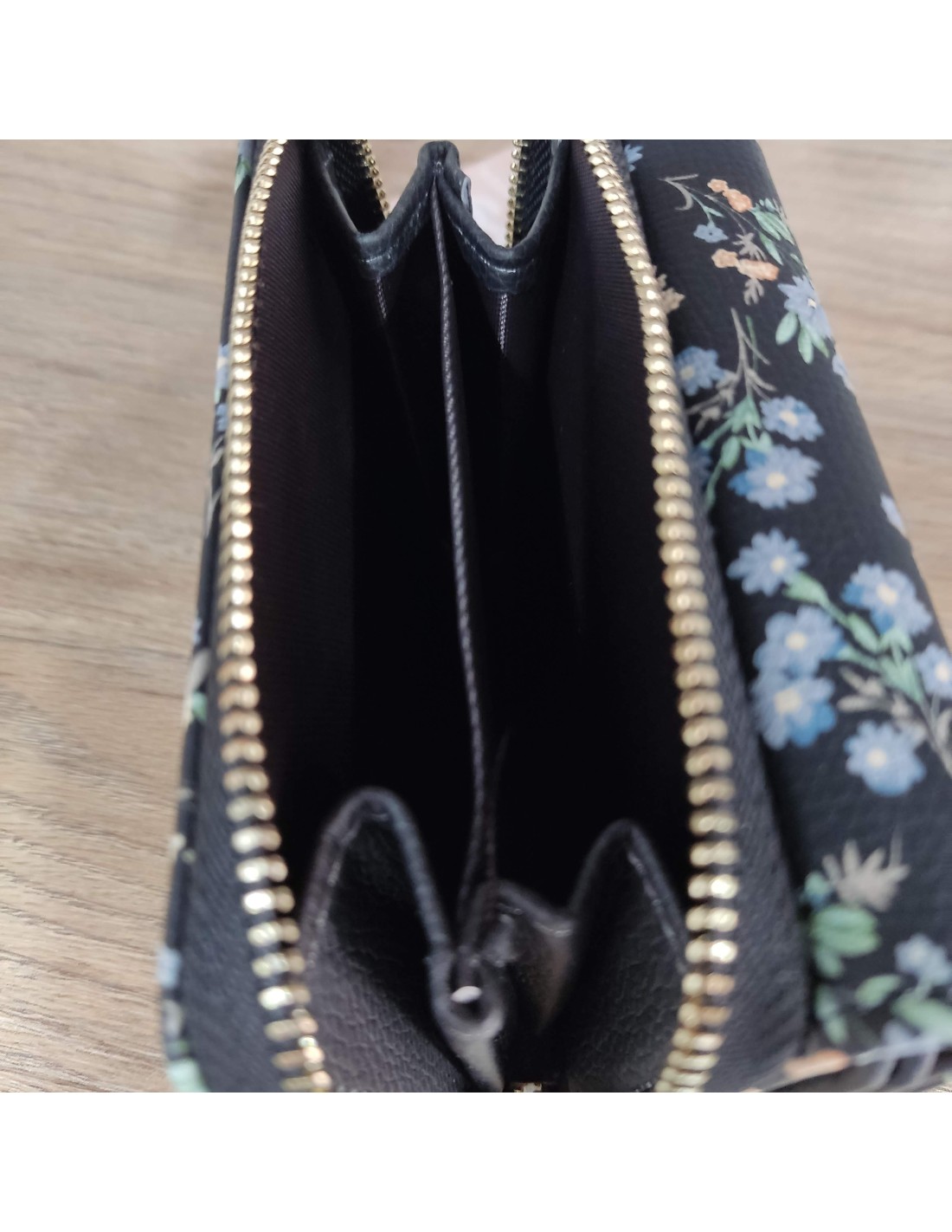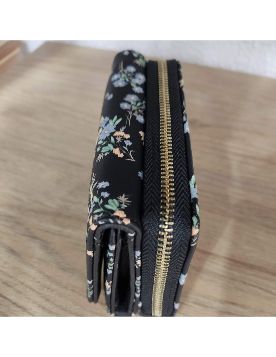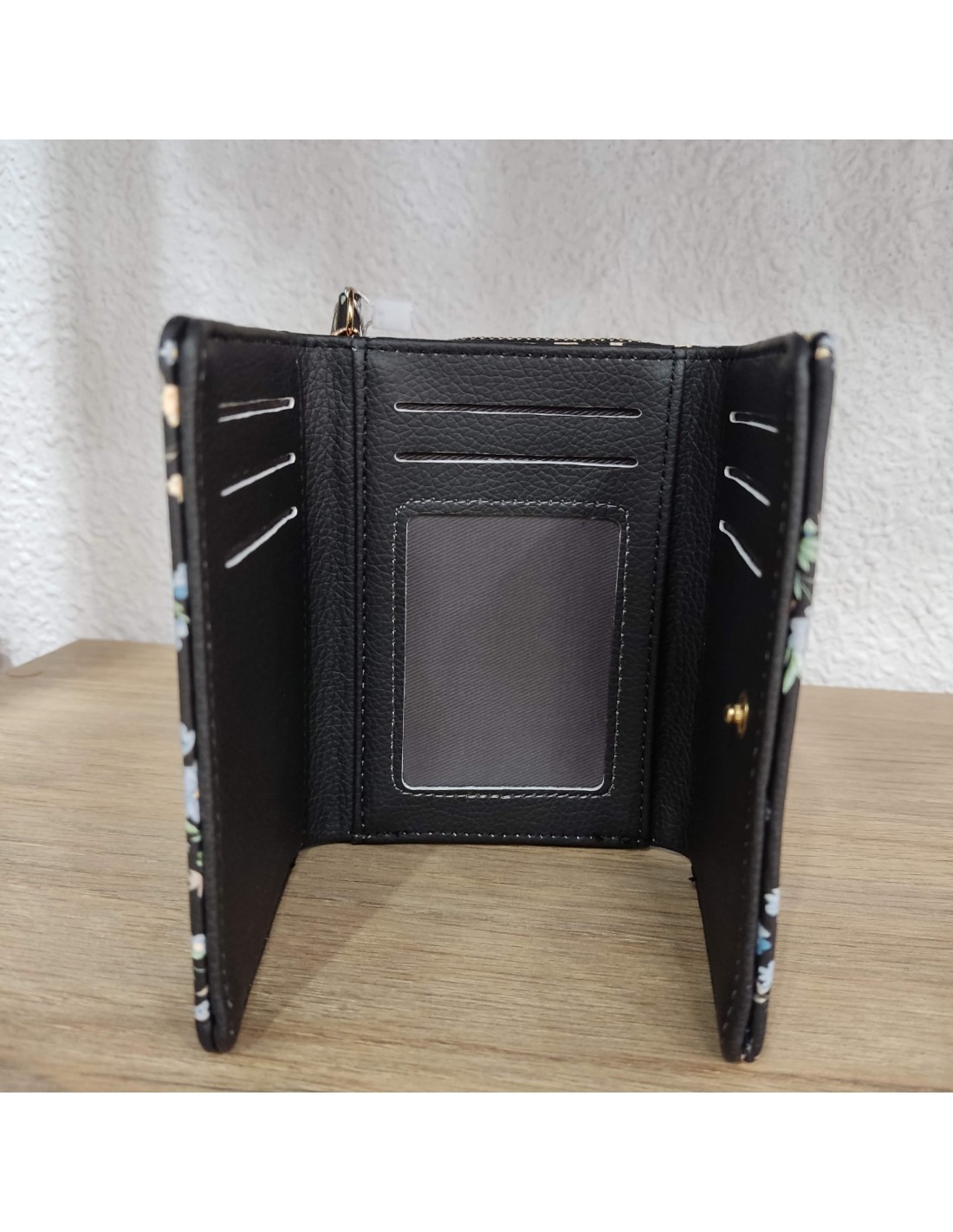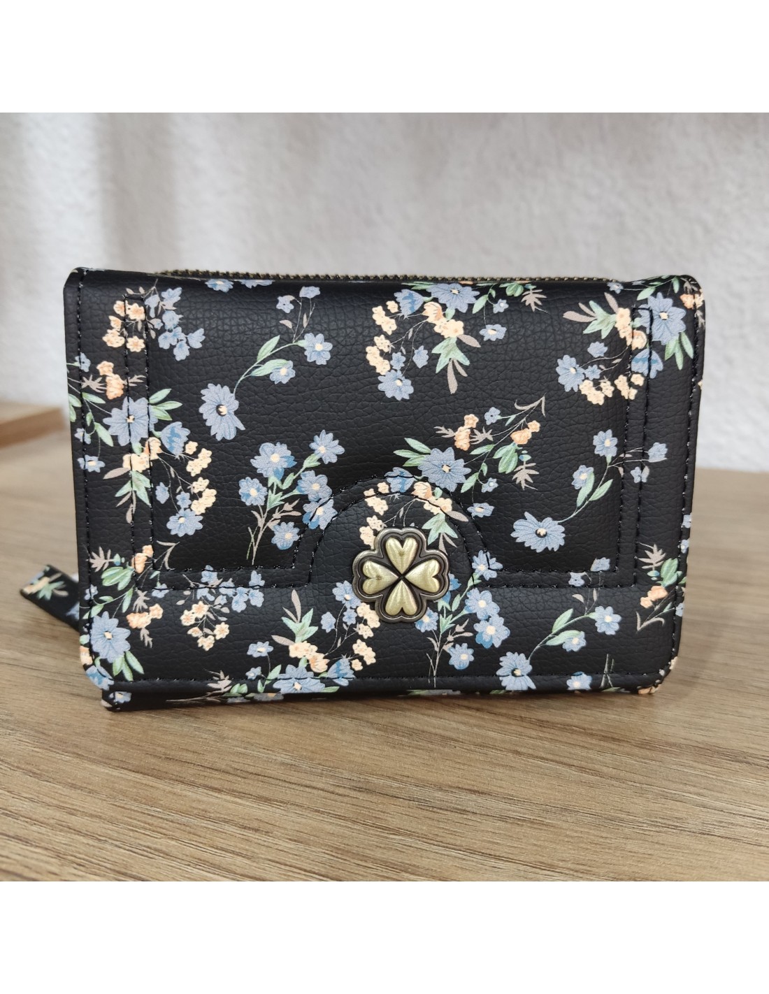 Monedero pequeño con estampado floral, cuenta con cierre adornado con una flor, espacio para monedas y compartimento para tarjetas.