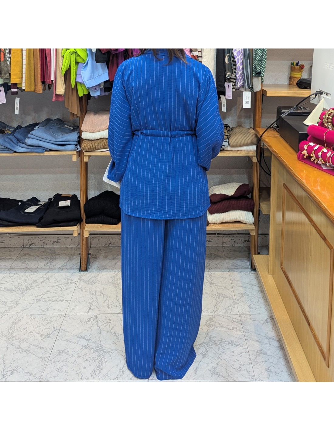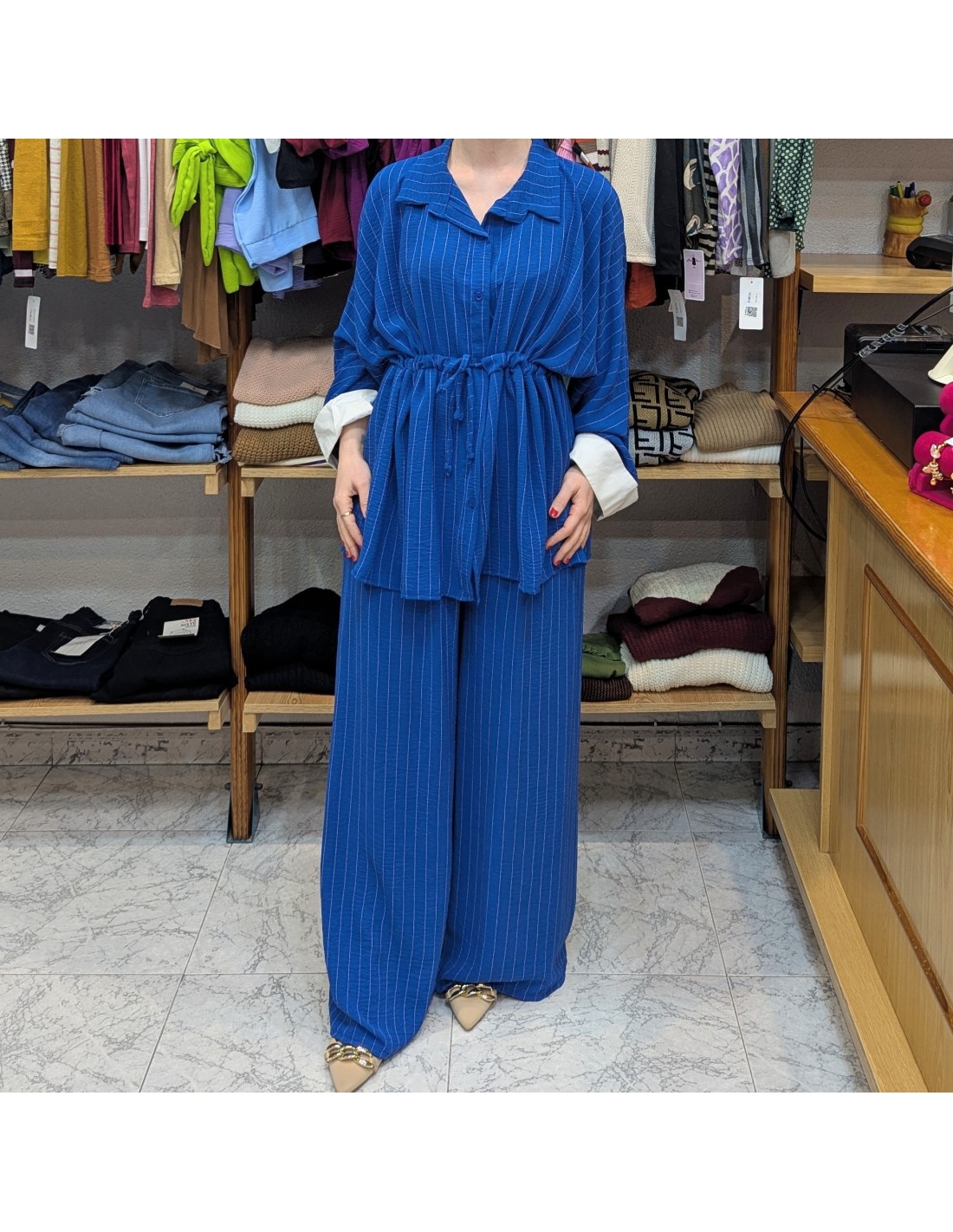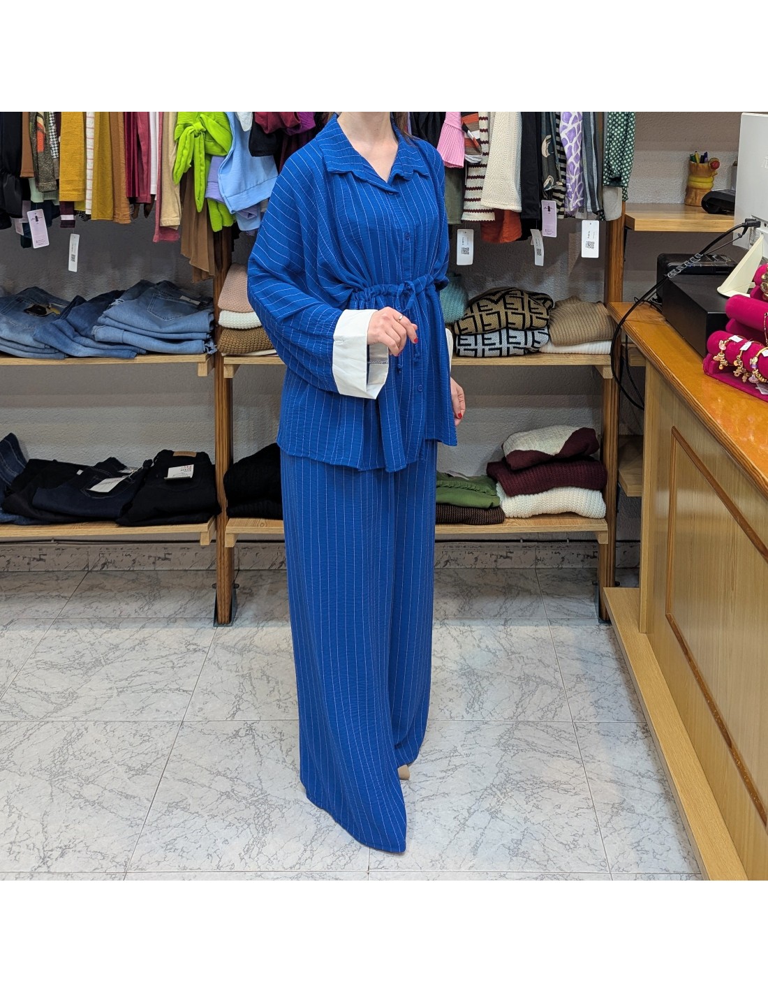 Elegante conjunto de talla grande en color azul y con estampado de raya diplomática, formado por dos piezas, blusa y pantalón, blusa de estilo camisero con botonadura a lo largo de la prenda y lazo en el bajo pecho para poder fruncirla, manga larga y ancha con efecto dobladillo en blanco. Pantalón de talle alto con cintura elástica, de corte palazzo, de caída fluida.