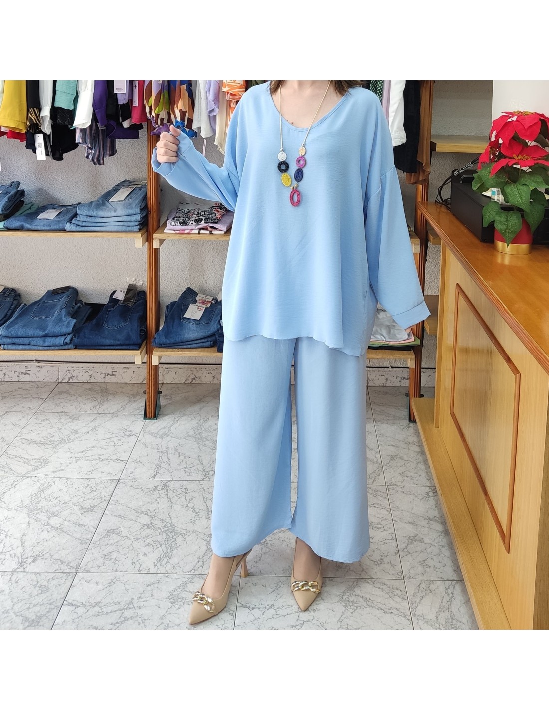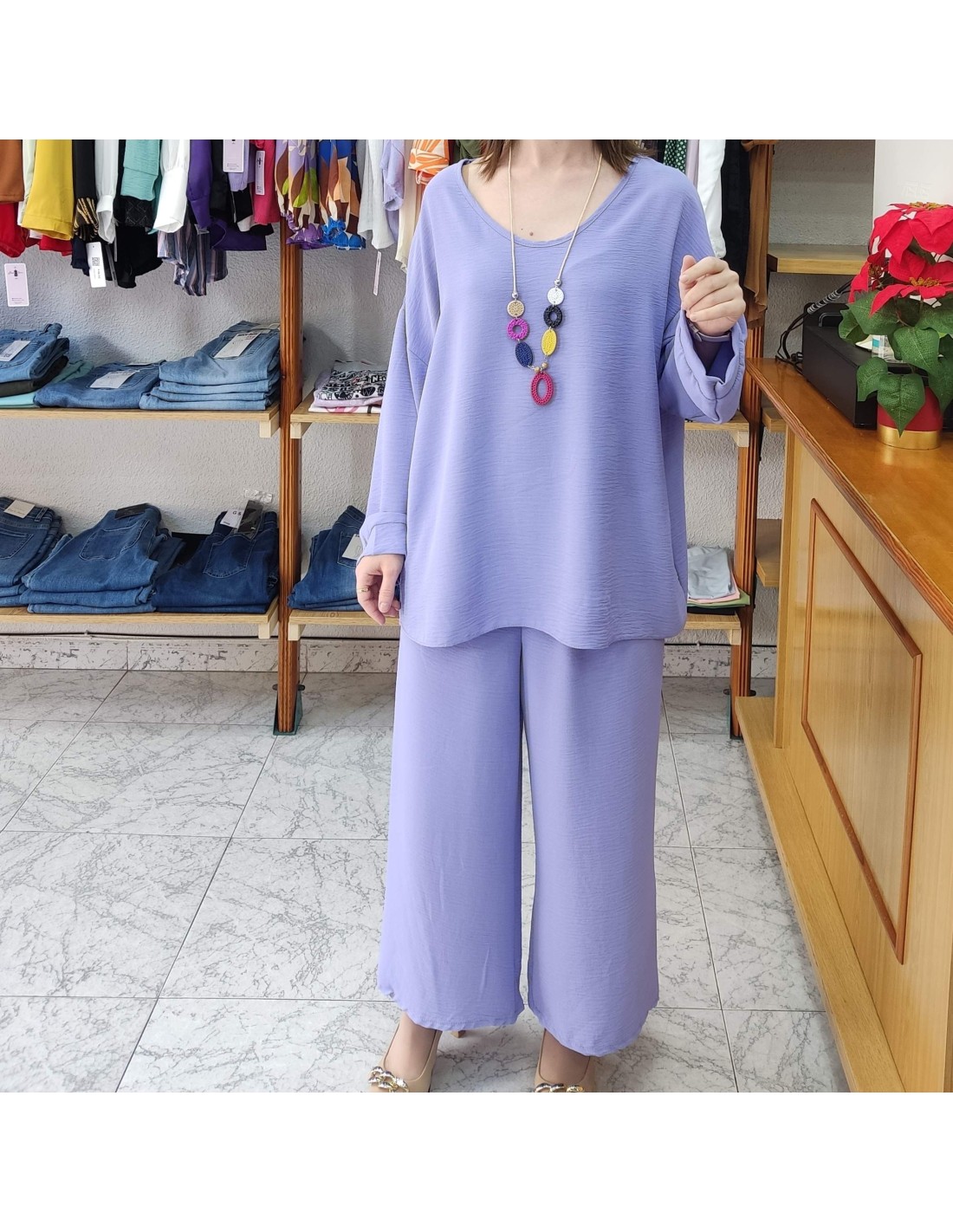Conjunto de estilo casual de 2 piezas, en color liso, formado por blusa de manga larga, corte ancho y hombros caídos. Pantalón de talle medio alto, goma en la cintura y pata larga de corte tobillero. Collar incluido.