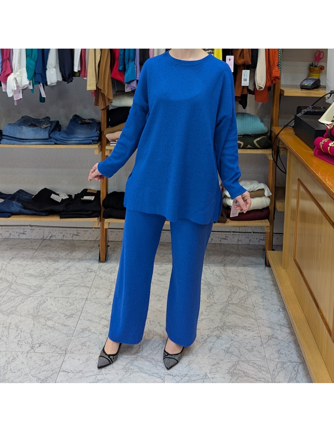 Conjunto de punto, de dos piezas en azul intenso, formado por suéter y pantalón, tiene un diseño holgado, cuello redondo y manga larga. Pantalón de talle alto con cintura elástica y de corte recto y ancho.
