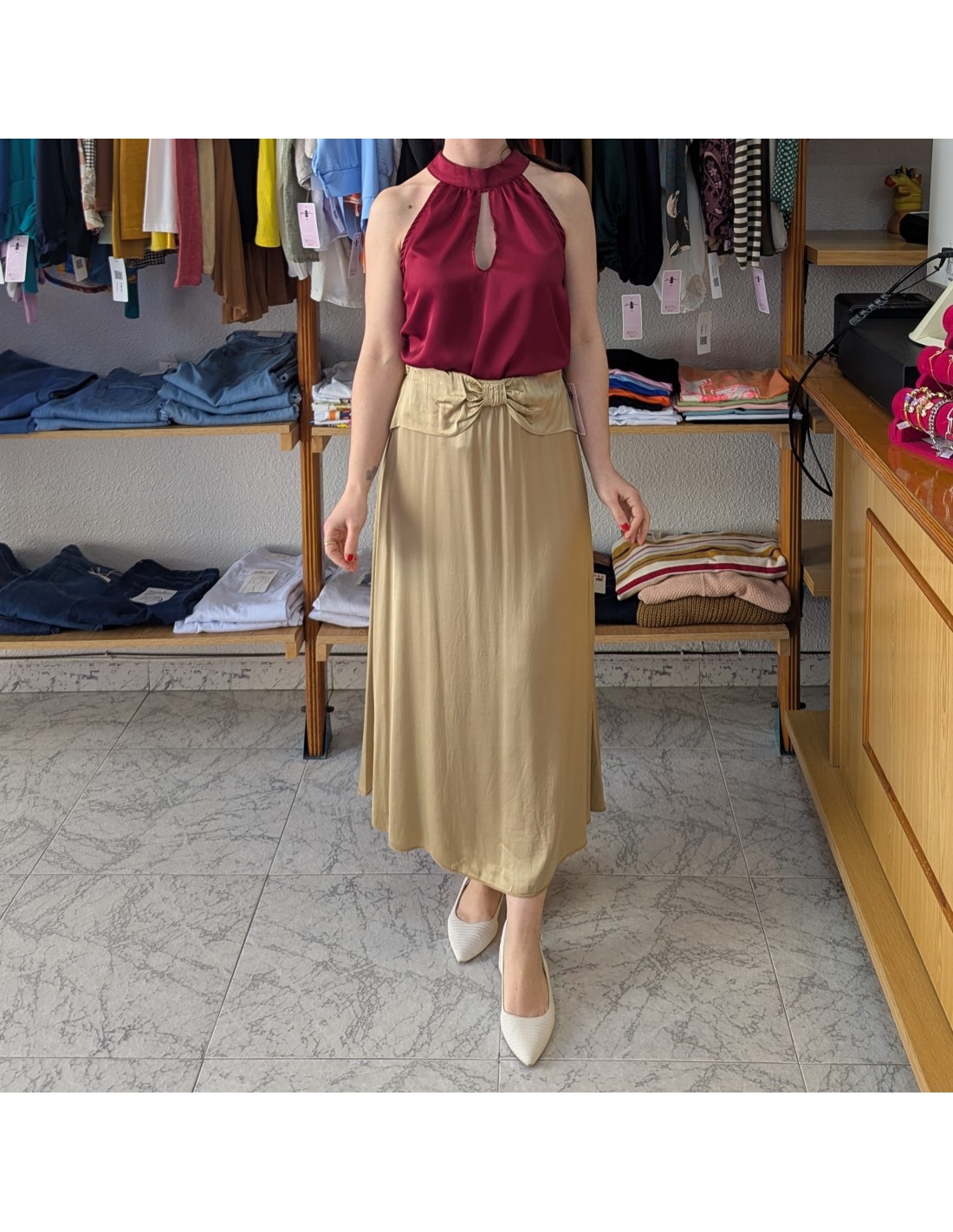 Elegante falda satinada, de largo midi, tiene el talle medio alto y la cintura elástica, de tejido ligero lo que le otorga una caída suave y movimiento. Detalle de lazo en la zona de la cintura.