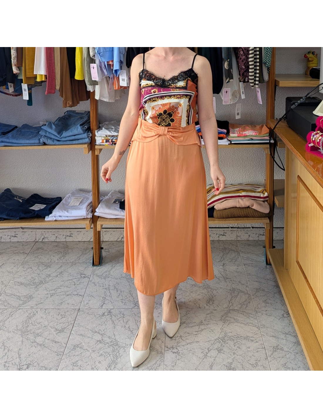 Elegante falda satinada, de largo midi, tiene el talle medio alto y la cintura elástica, de tejido ligero lo que le otorga una caída suave y movimiento. Detalle de lazo en la zona de la cintura.